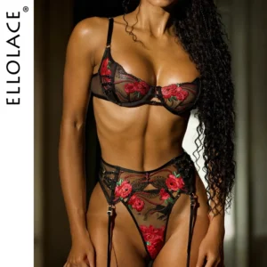 Ellolace Seductive Sexy Lingerie Bra Belt Thong 3PC Set Beautiful Floral Embroidered Intimate Tempted Women Underwear