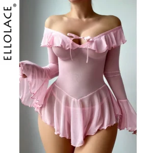 Ellolace Sexy Body Lingerie Women Flare Sleeve Baby Dolls Ladies Ruffled Sweet Girl Transparent Mini Dress Erotic Costume