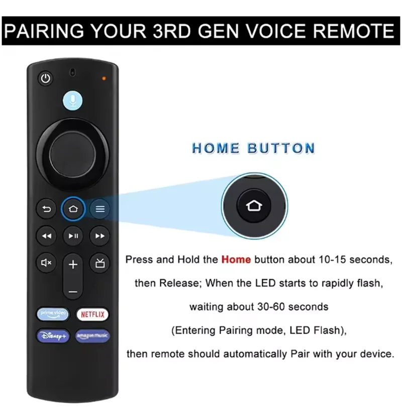 (2) Press and hold the Home button on the new remote for at least 10 seconds, The LED on the remote will slowly flash amber. Continue holding down the Home button until the LED starts to rapidly flash. A notification will appear on your screen indicating that your remote is successfully paired.