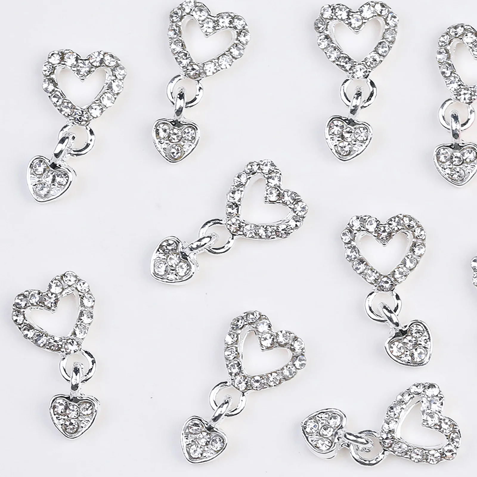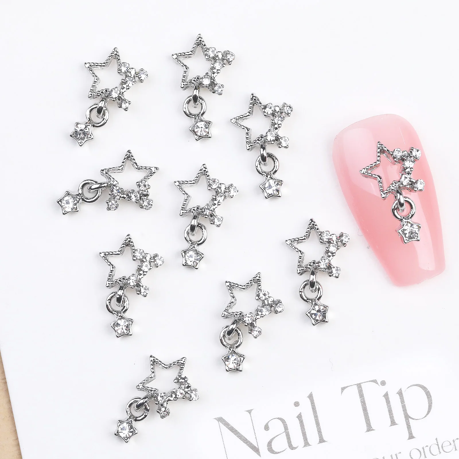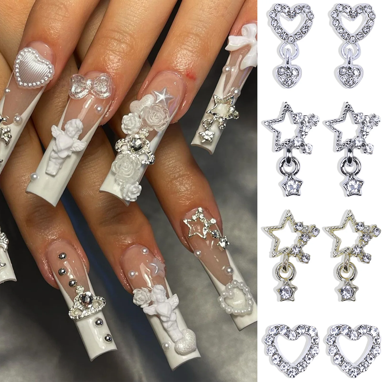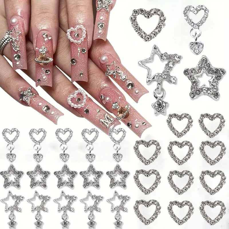 10/20PCs Silver Star Nail Charms With Rhinestones Shiny 3D Alloy Heart Nail Jewelry Y2K Charms For Acrylic Nails Decoration