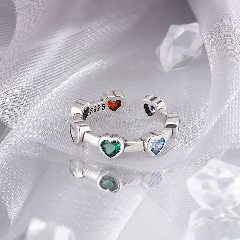 100% Solid 925 Sterling Silver Heart Rings For Women Green Red Stone Simple Trendy Retro Anillos Party Gifts Accessories