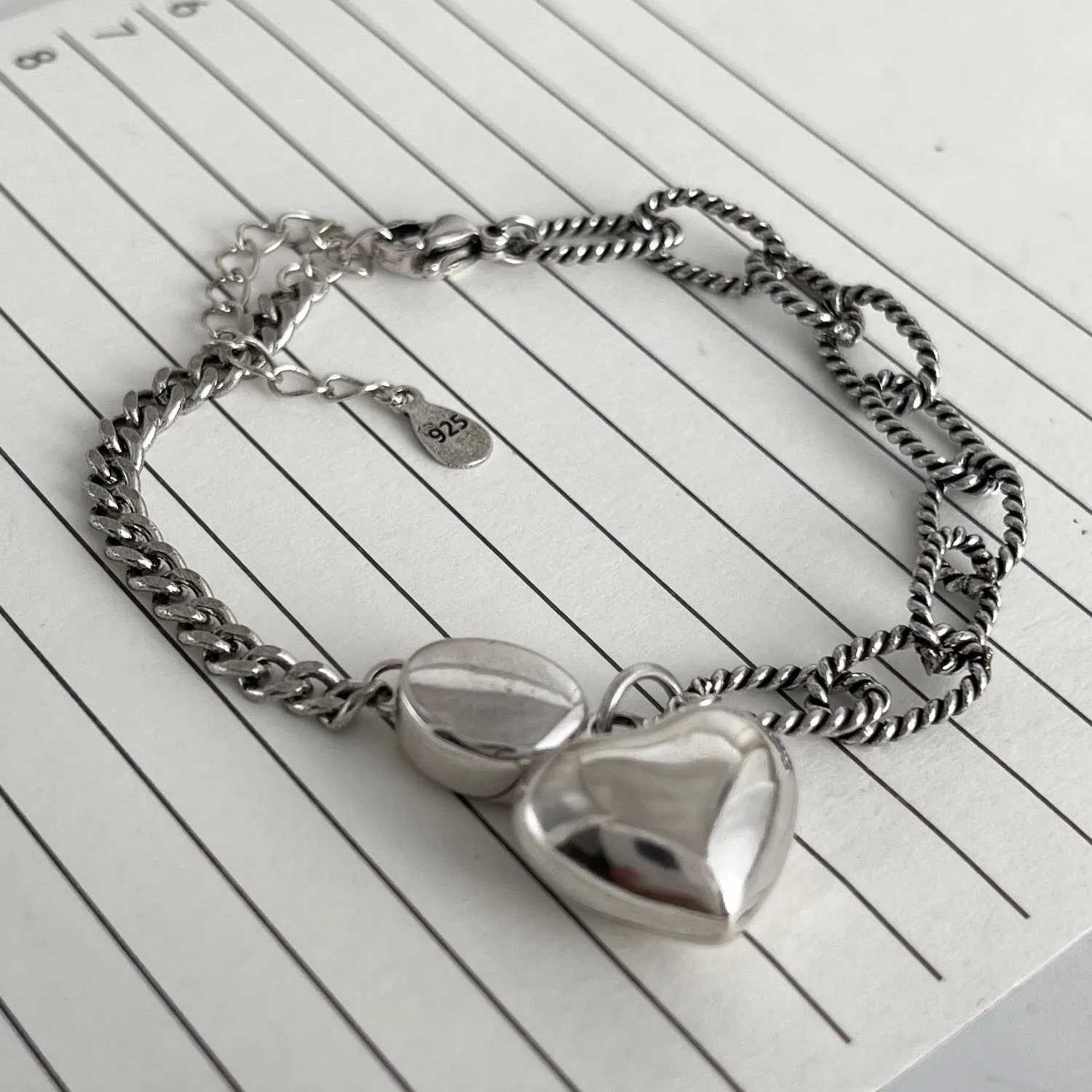 100% Solid 925 Sterling Silver Retro Bracelet for Women Men Vintage Handmade Heart Bracelet Birthday Gift