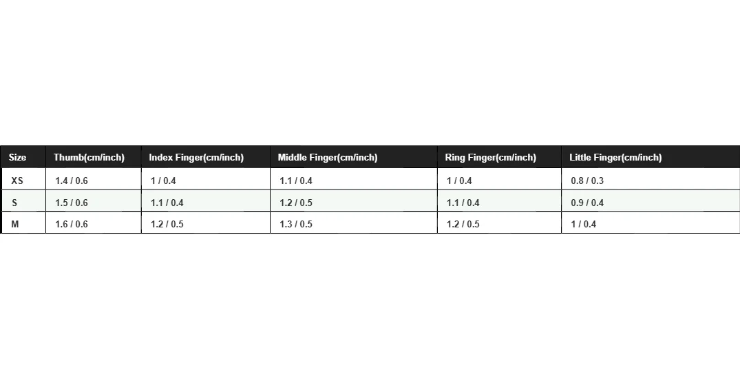 Size,Thumb(mm),Index Finger(mm),Middle Finger(mm),The Fourth Finger(mm),Little Finger(mm)