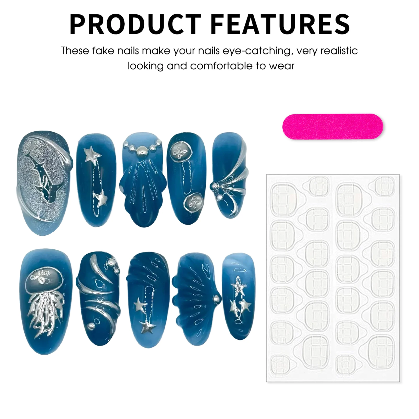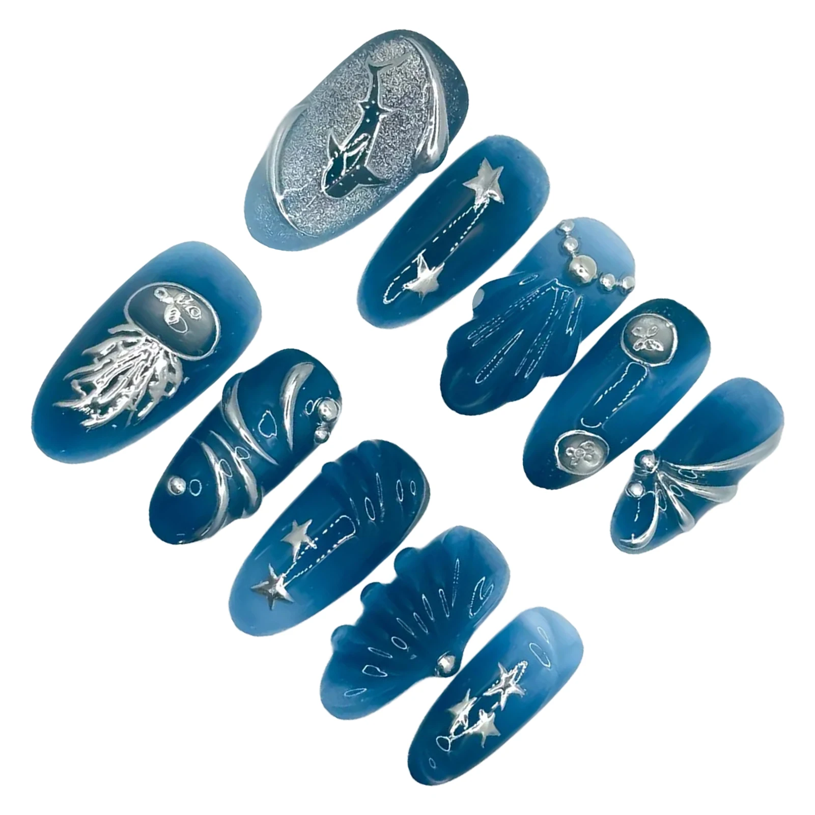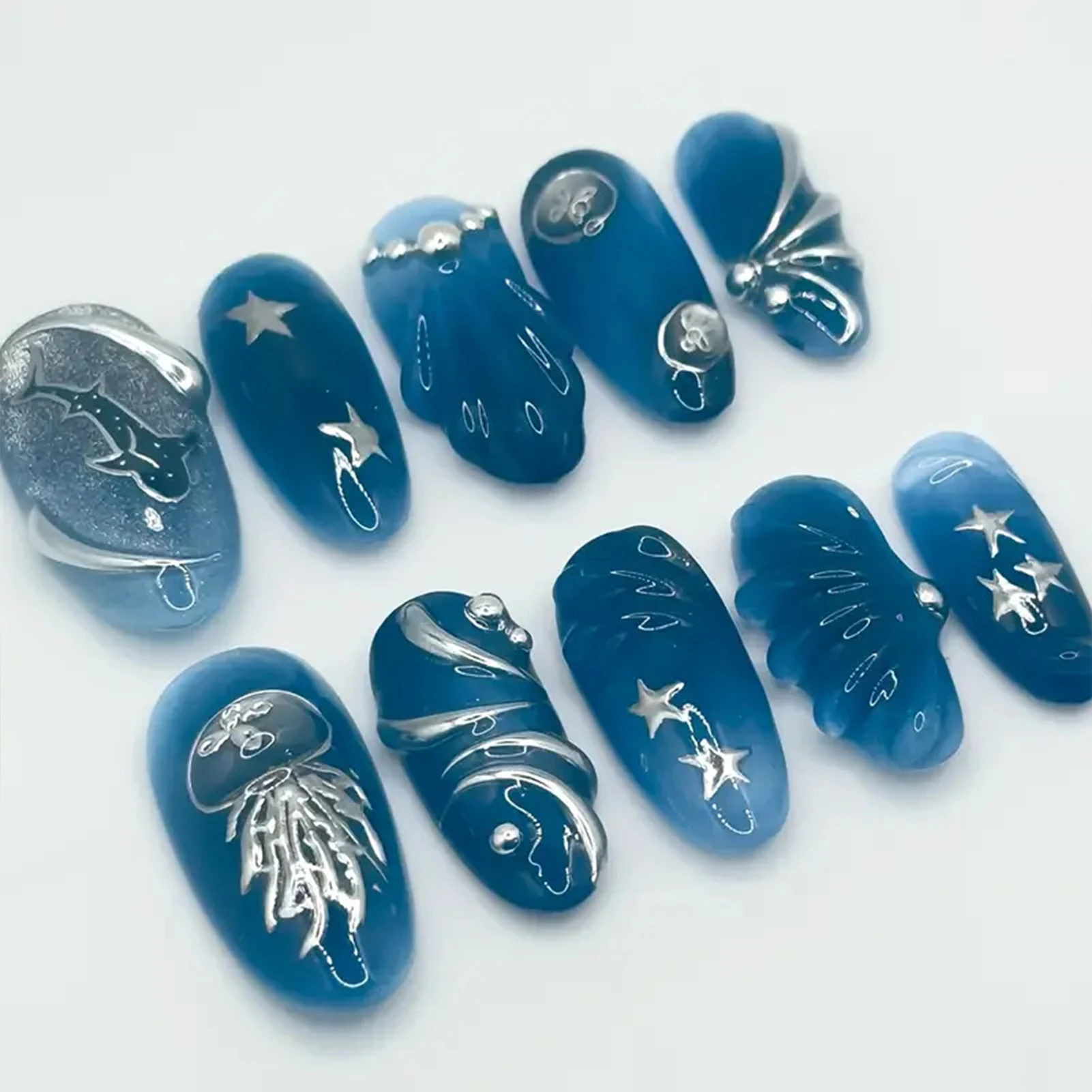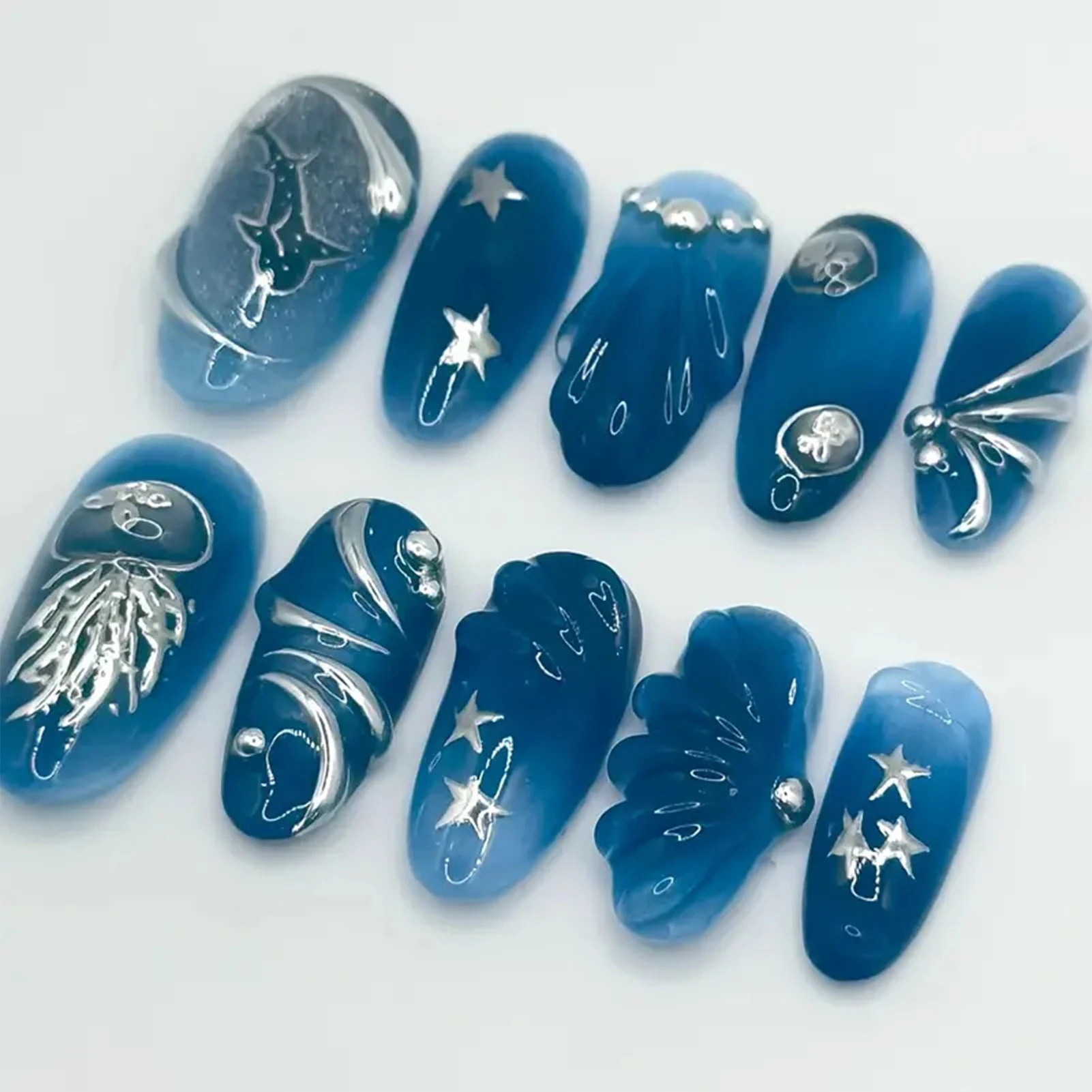 10pcs Gradient Blue Almond Press On Nails Hand-painted Silver Jellyfish Seasells Pattern Fake Nail Handmade Y2k Star False Nails
