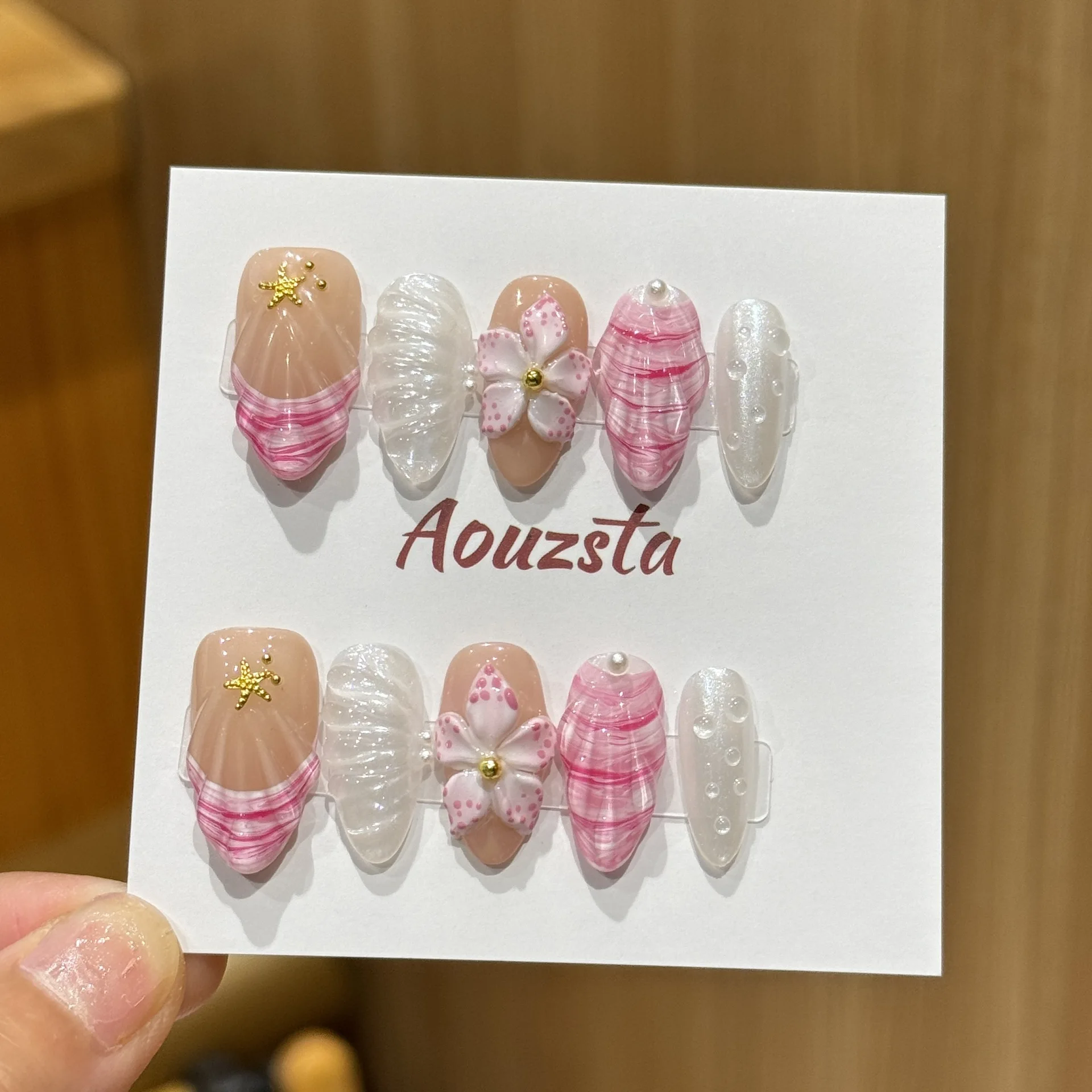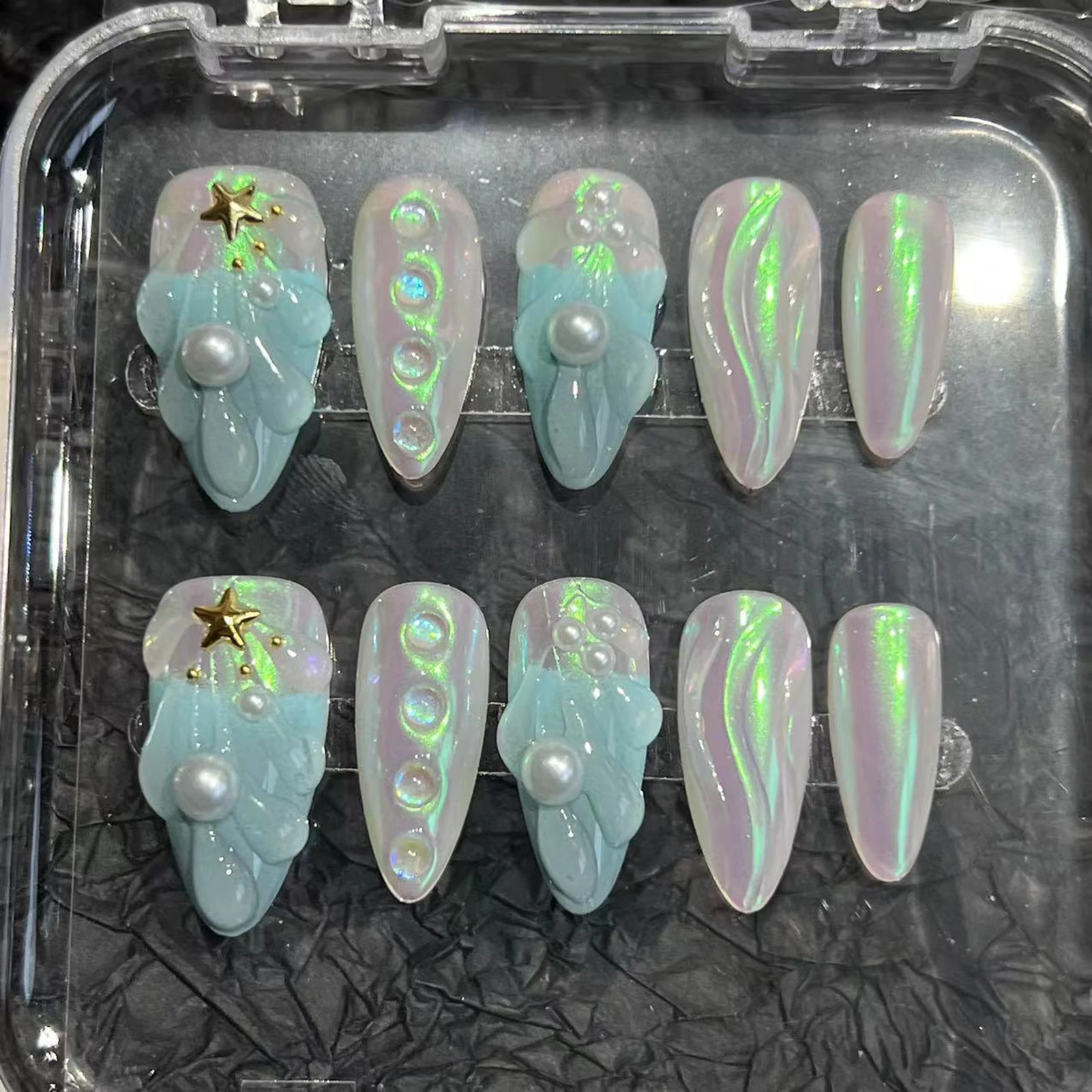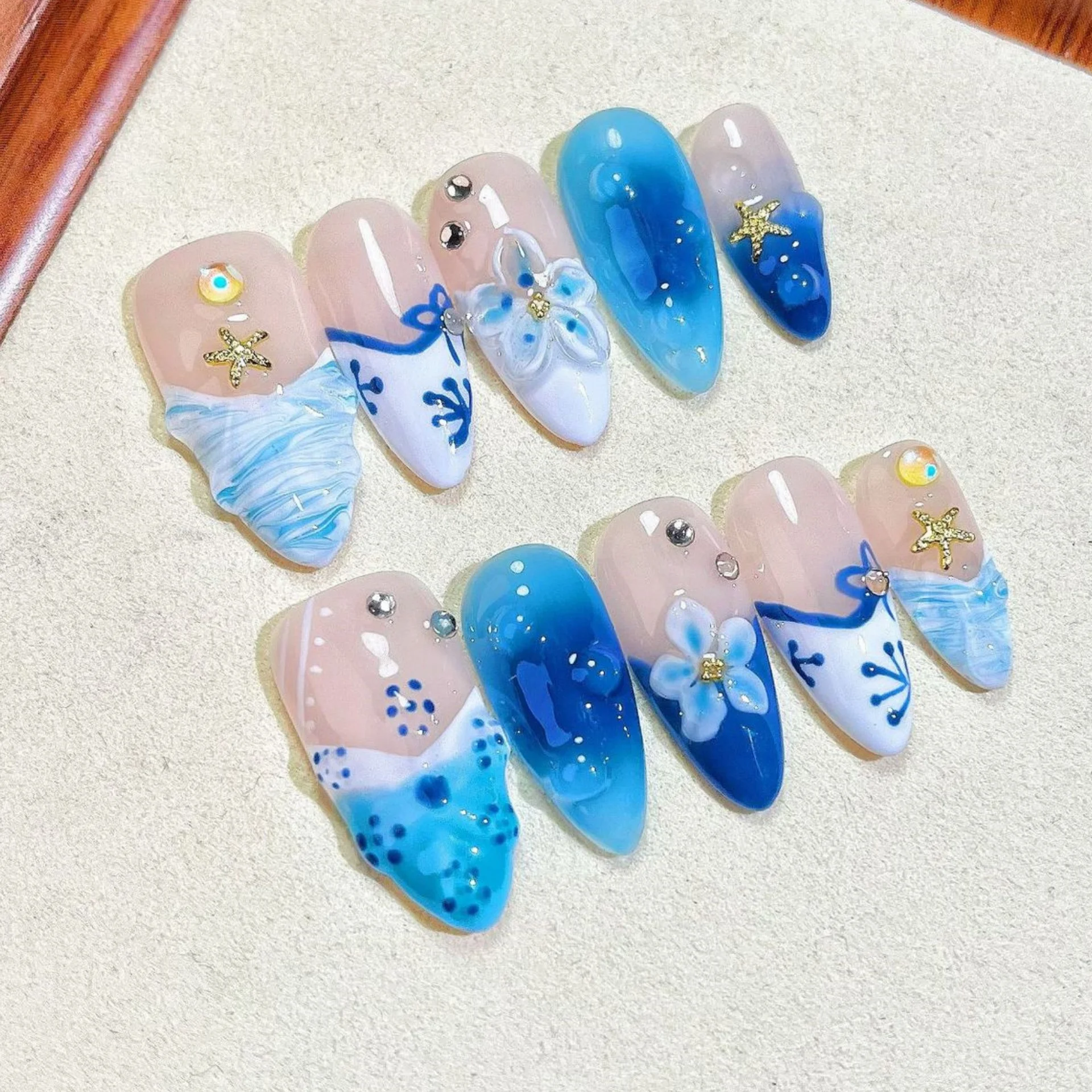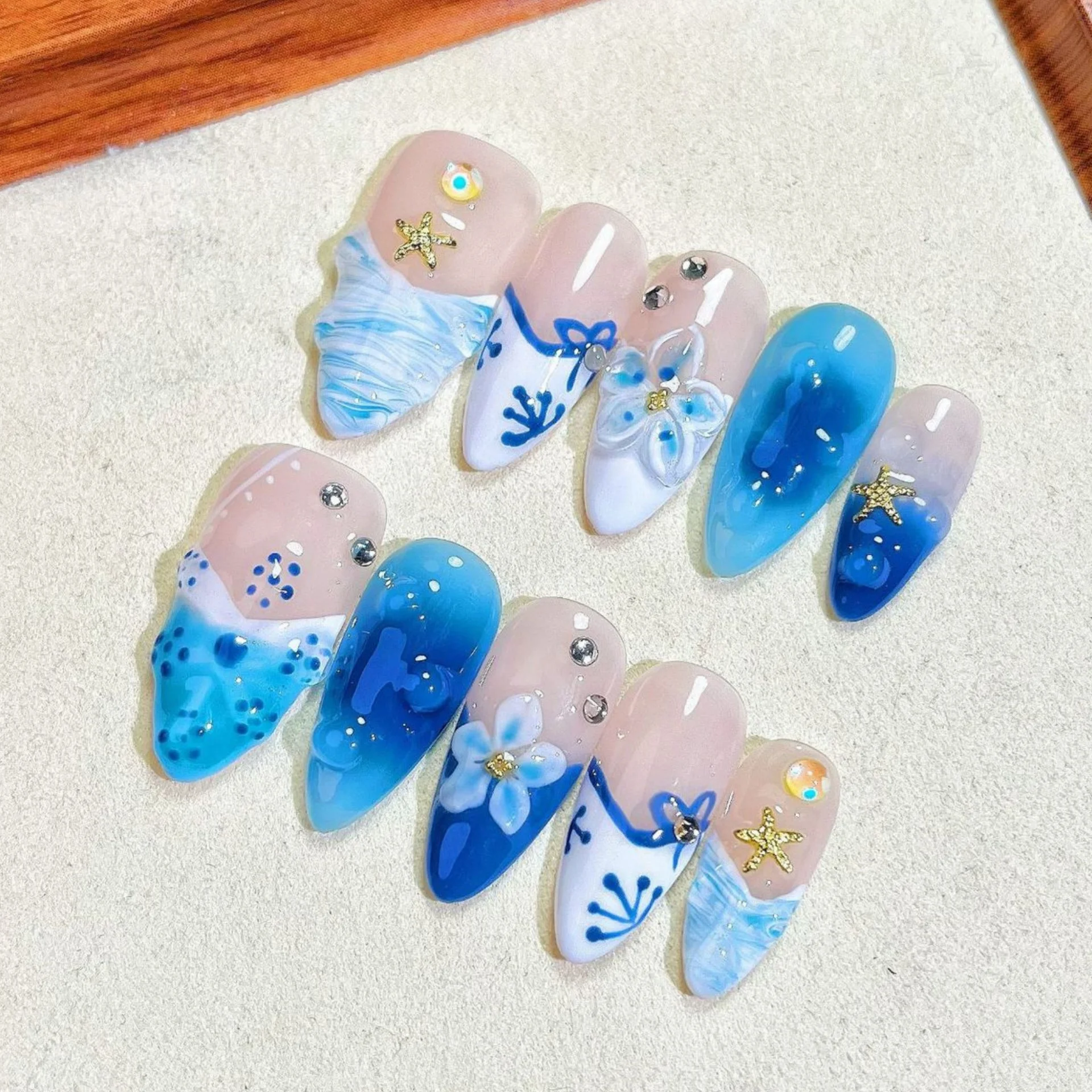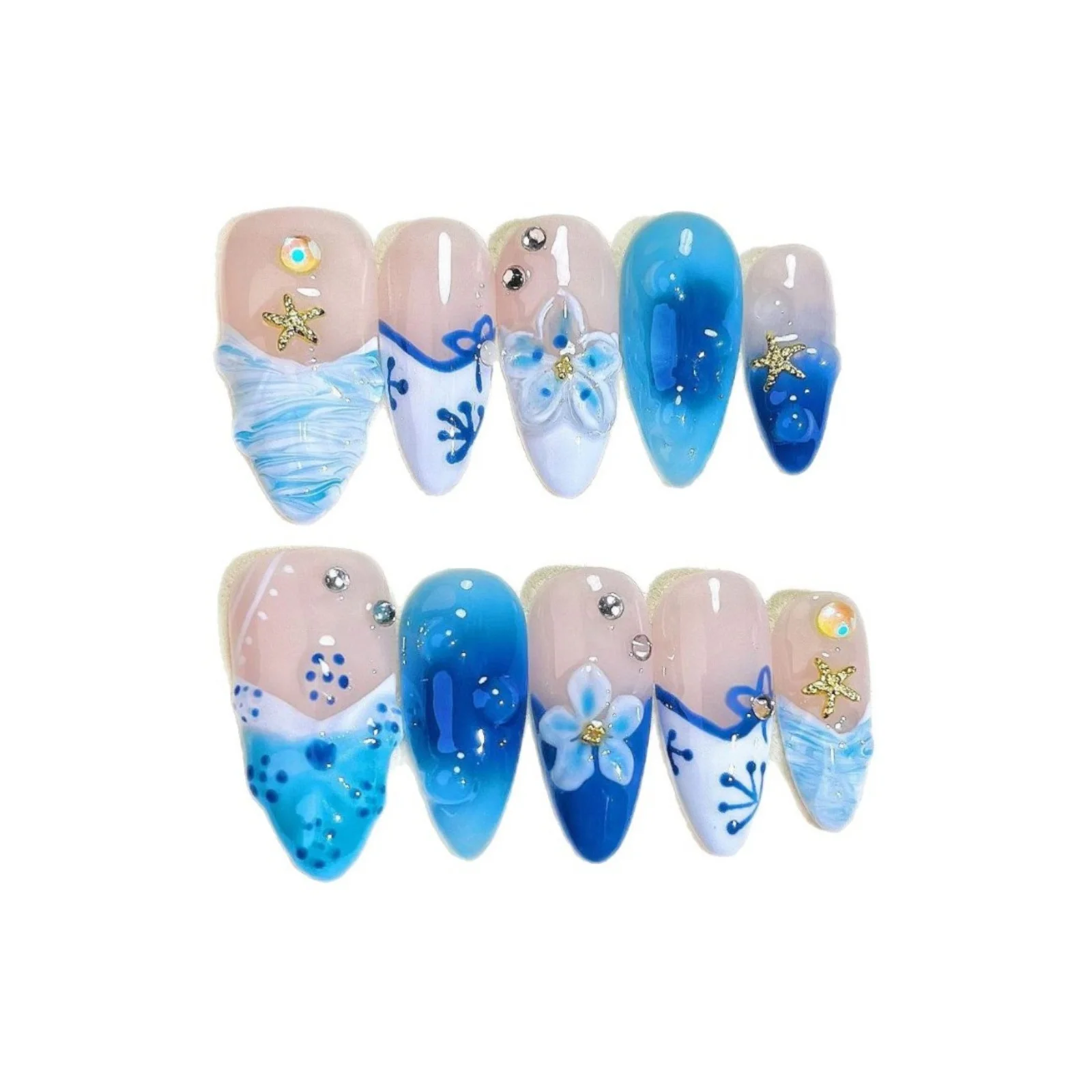 10pcs Gradient Blue French Style Press On Nails Handmade Carved 3D Flower Seashell False Nail Summer Ice Transparent Almond Nail