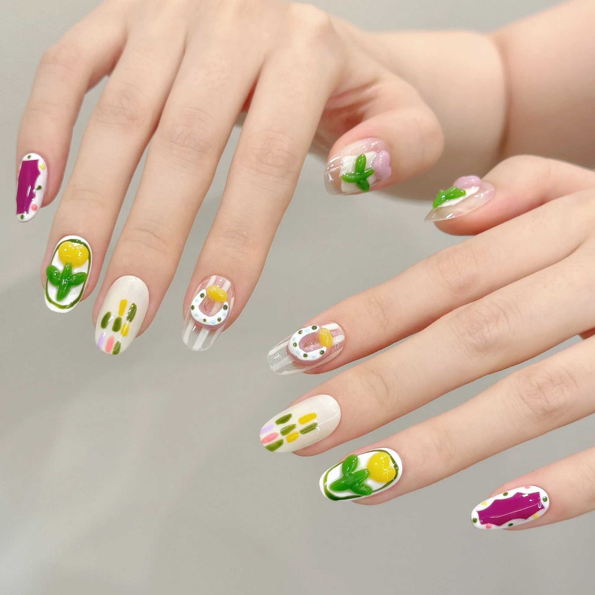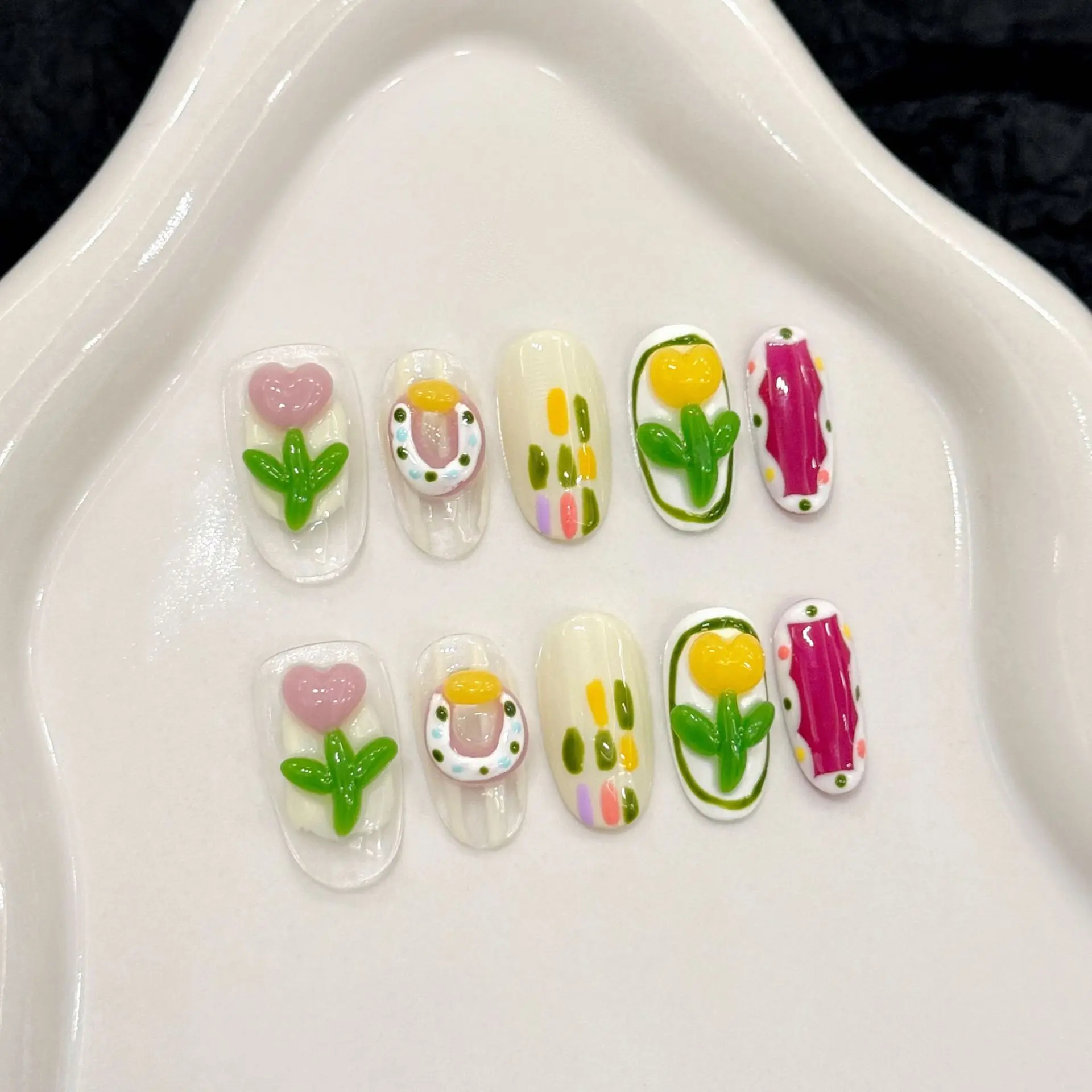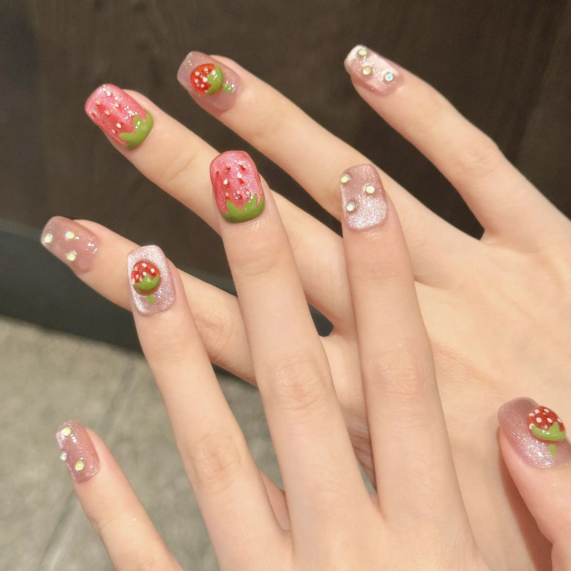 10pcs Handmade Press on Nails 3D Strawberry Decor Fake Nails for Girl Wearable Detachable Short Pink Cat Eye False Nail Tips
