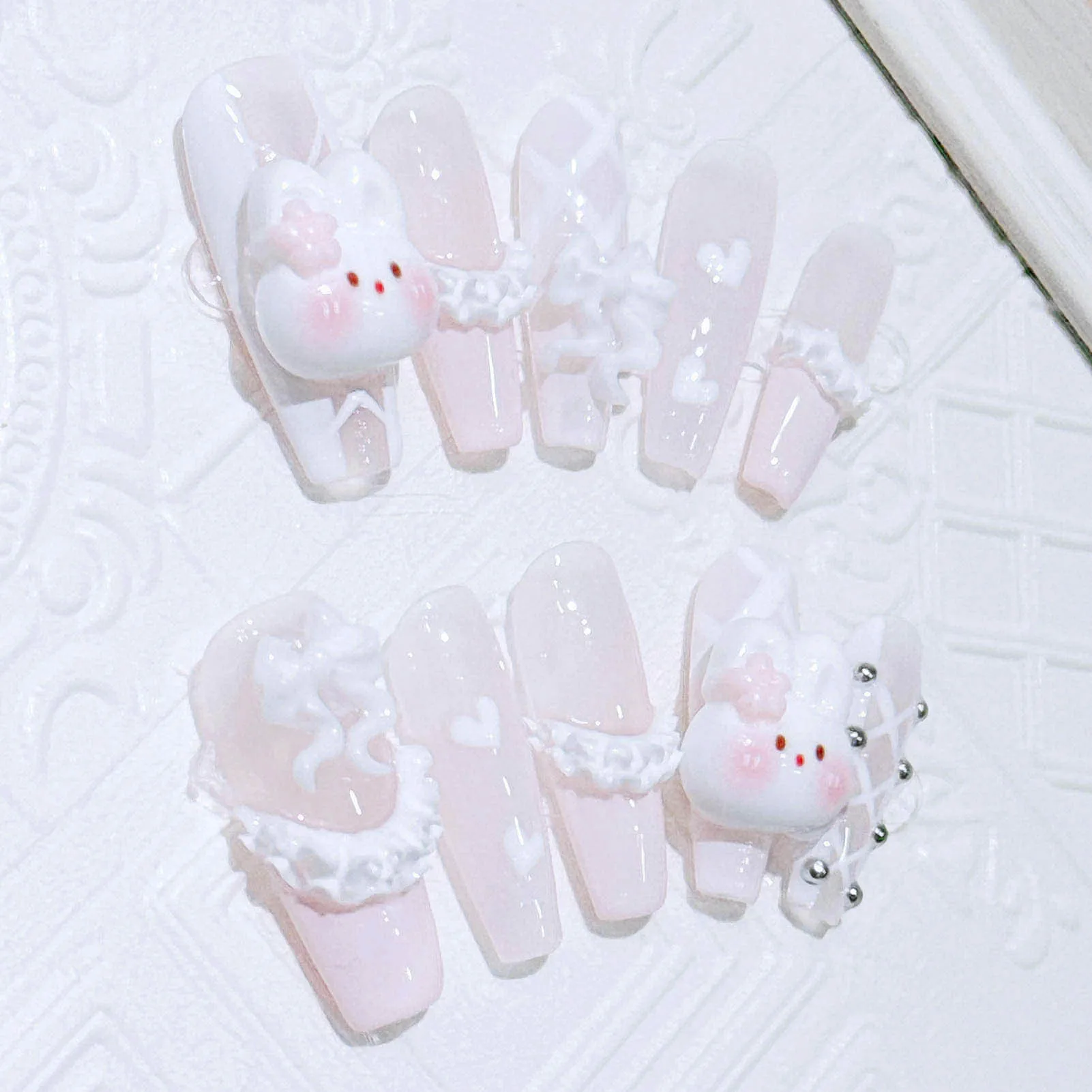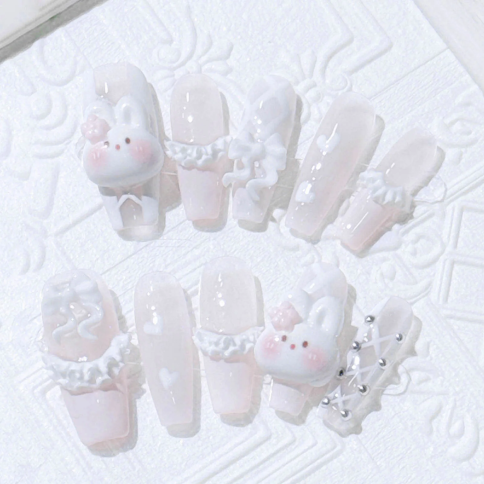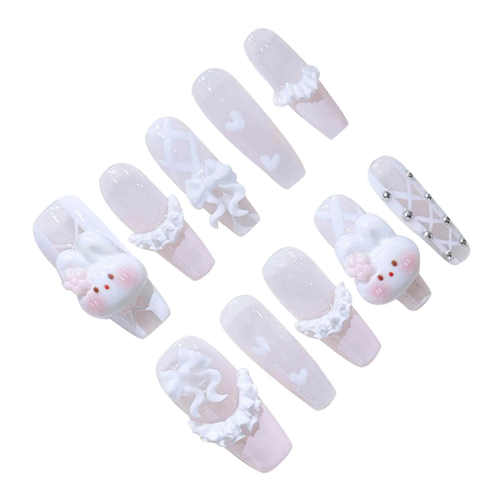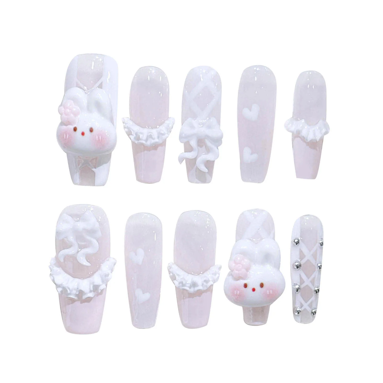10pcs Handmade Press On Nails Light Pink French Style White Long Coffin False Nails Cute 3D Rabbit Designs Sweet Fake Nail Tips
