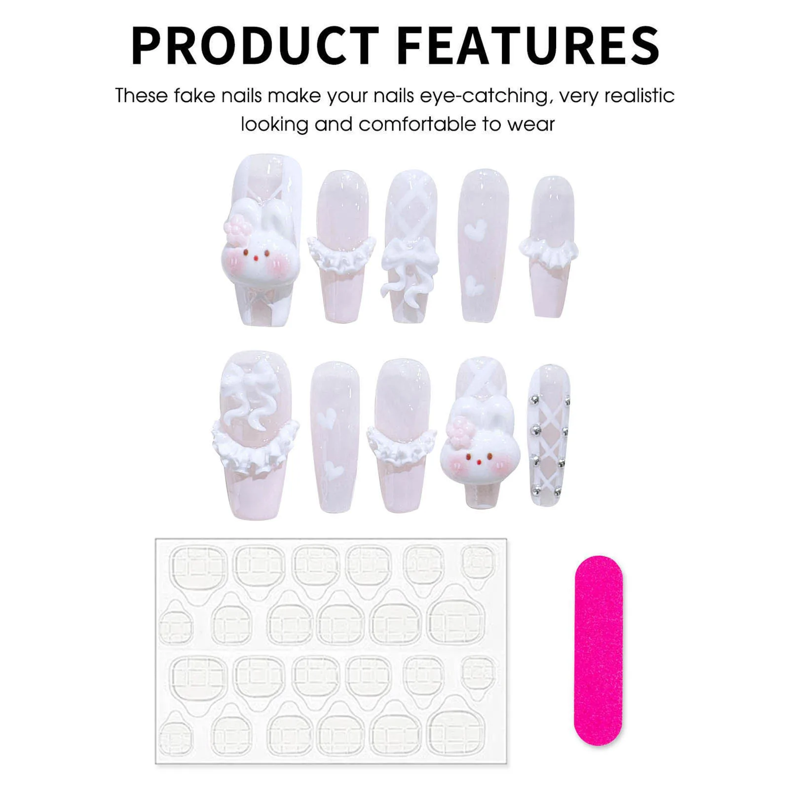 Full Coverage and Sweet Rabbit False Nails: These false nails provide full coverage, ensuring a pretty and professional-looking manicure. The sweet rabbit design adds a playful and charming element.