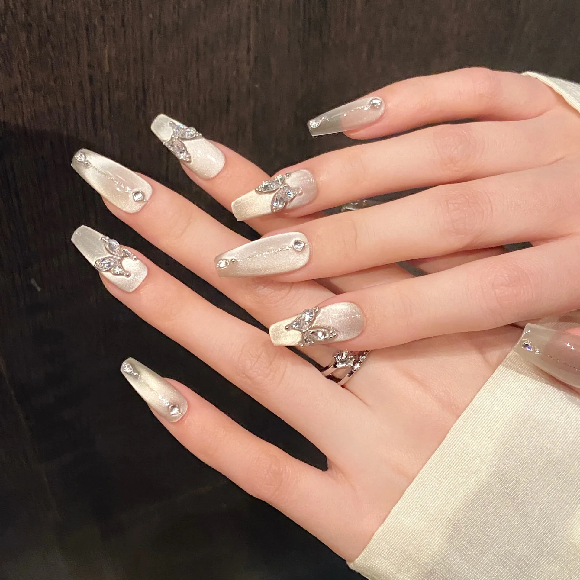 10pcs Handmade Press on Nails Shiny Sliver Cat Eye Fake Nail Tips with Sliver Butterfly Design Wearable Fashion False Nails