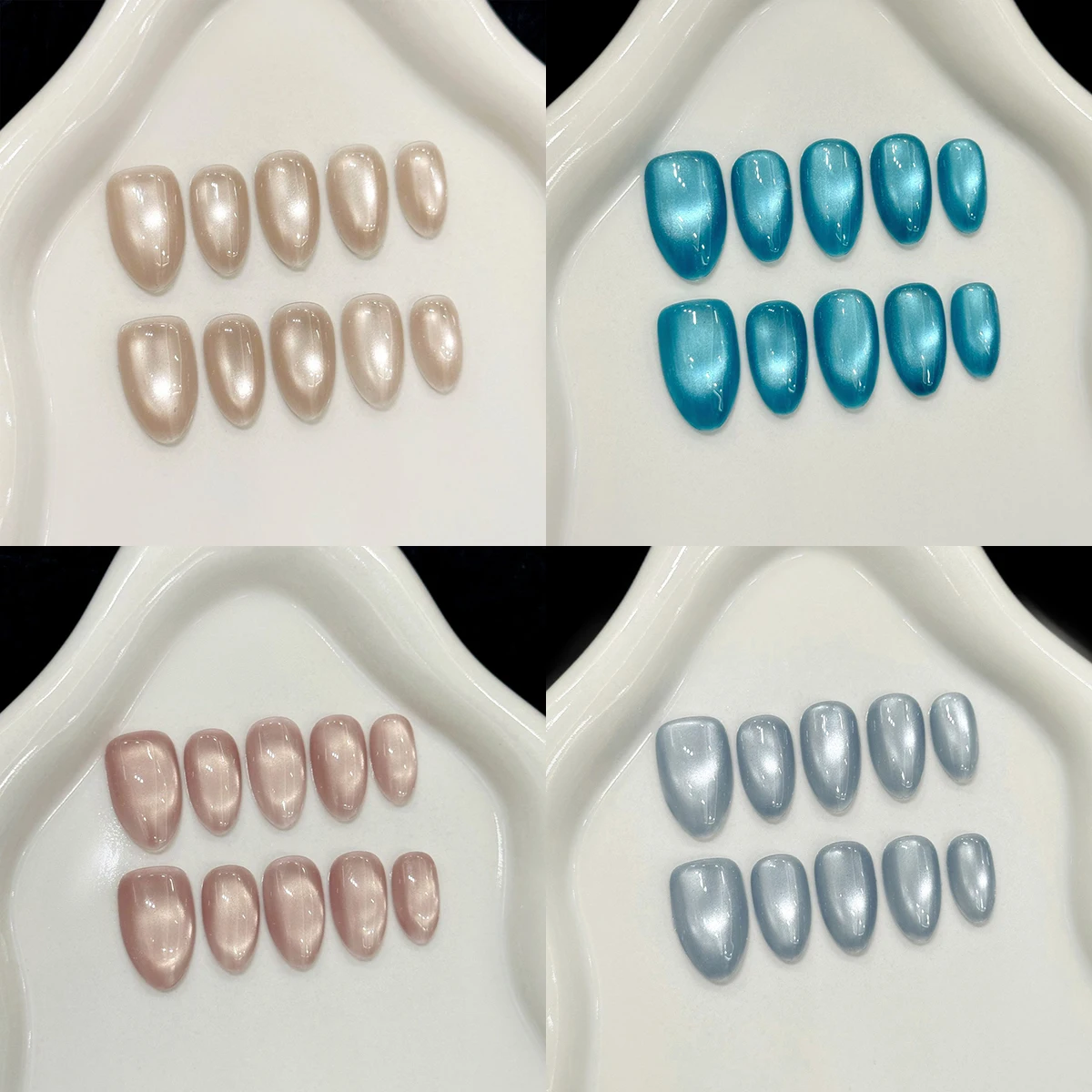 10pcs Handmade Press on Nails Solid Color Glass Bead Cat Eyes Fake Nails Reusable Ins Simple Long Almond False Nail Tip Wearable