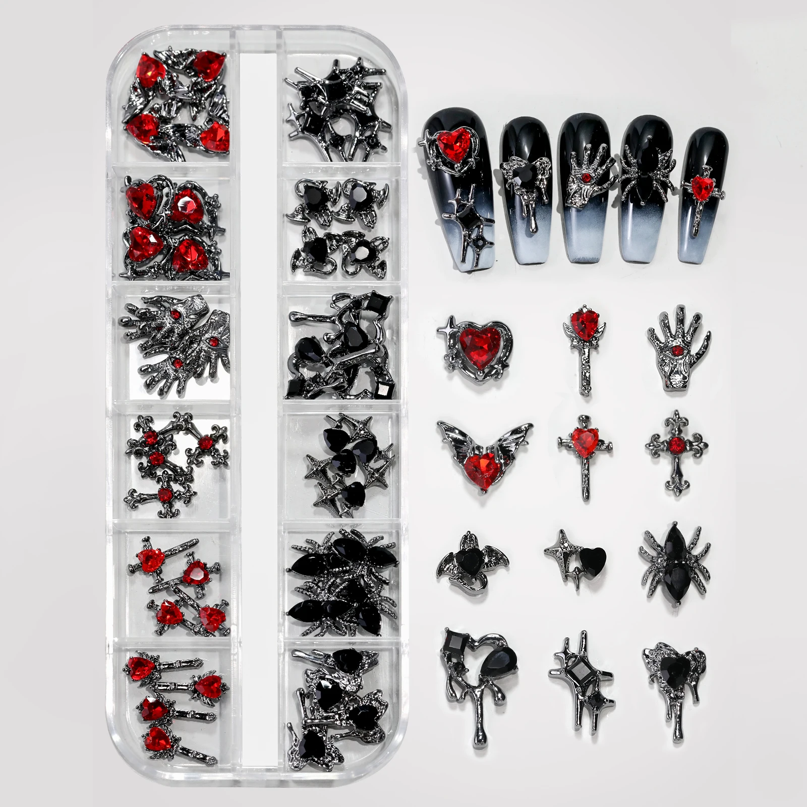 12 Grid Retro Alloy Nail Art Jewelry Gothic Punk Style Y2k Heart-Shaped Cross Spider Pattern DIY Nail Decoration Accessories