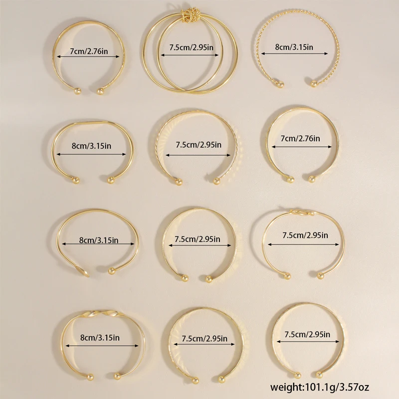 Be the first to review “12 Pcs/Set Trendy Multilayer Open Bangles Set for Women Punk Gold Color Geometric Delicate Twist Bracelets Wedding Jewelry Gifts” Cancel reply