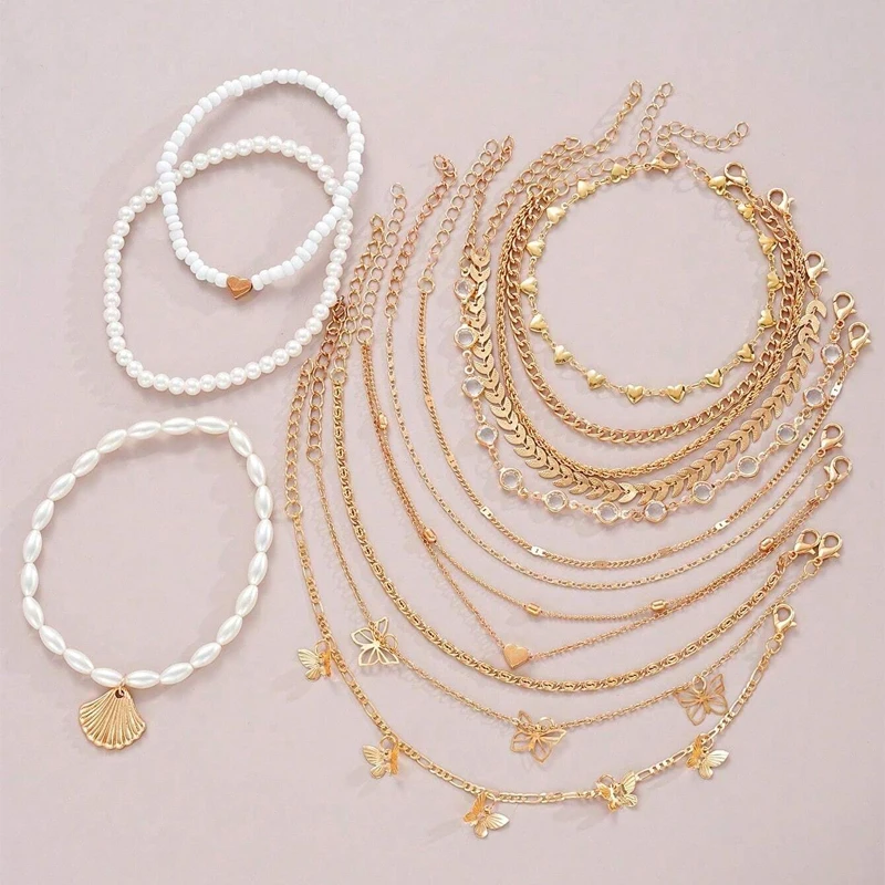 20 Pcs/Set Fashion Metal Butterfly Heart Pendant Anklets Set Bohemia Vintage Pearl Foot Bracelet Beach Woman Jewelry Gifts 2024