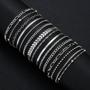 15 Pcs/Set Dainty Silver Color Metal Bracelet Set For Women Boho Retro Thick Twist Cuban Chain Bracelet Party Trendy Jewelry New