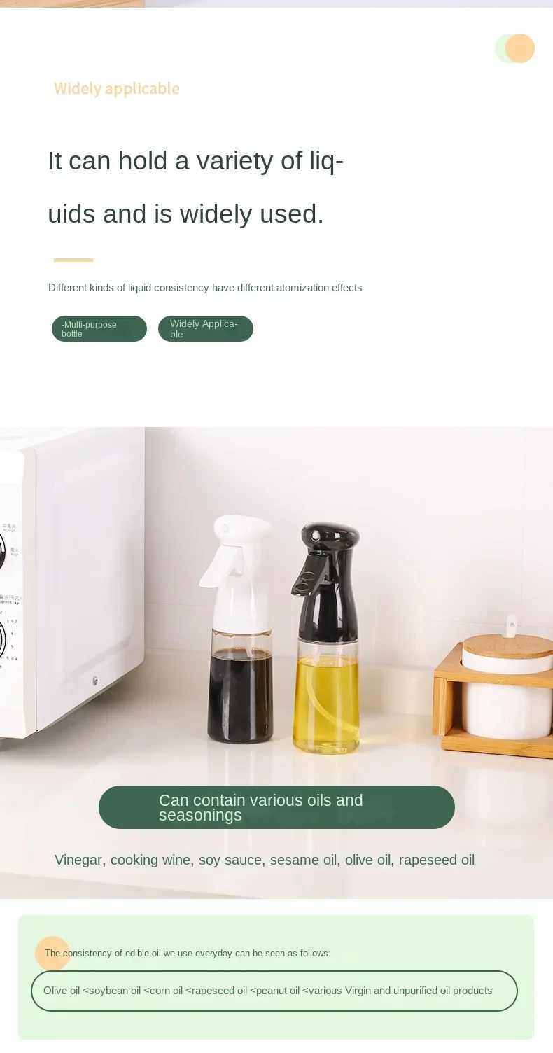The spray bottle is suitable for many occasions, such as cooking, roasting, baking, and so on.