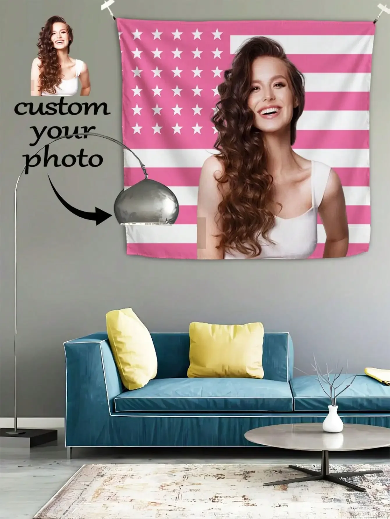 Free photo uploading: support portrait / Pet/couple photos, automatically adapted to the tapestry layout (the example picture is a template for female users)