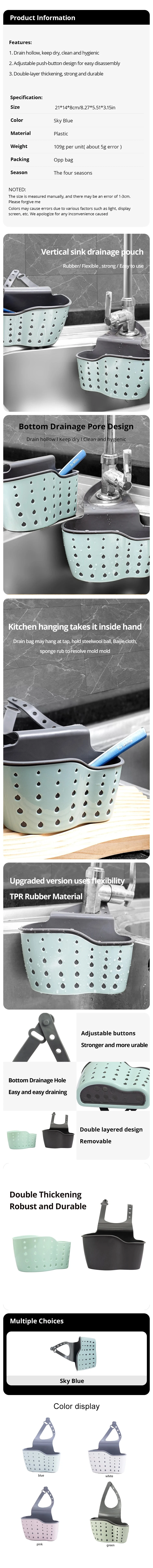 Clear filters• Creative Design :The Sky Blue Creative Sink Storage And Drainage Rack boasts a unique hanging bag design, adding a touch of creativity to your kitchen decor.