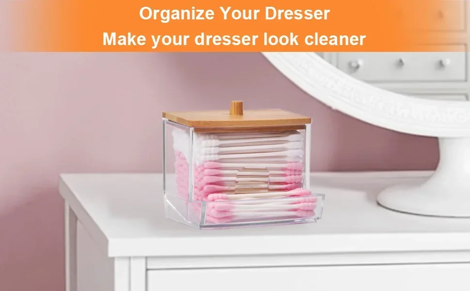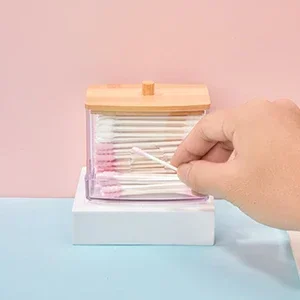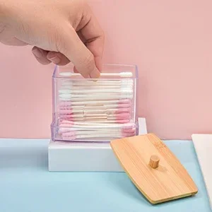 1Pcs Cotton Swab Holder, Cotton Swab Dispenser with Bamboo Lids,Bamboo Bathroom Storage Jars Storage Containers Clear Plastic