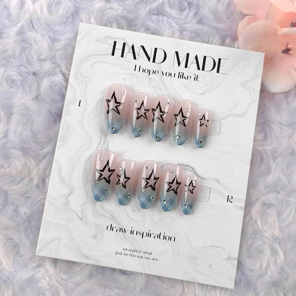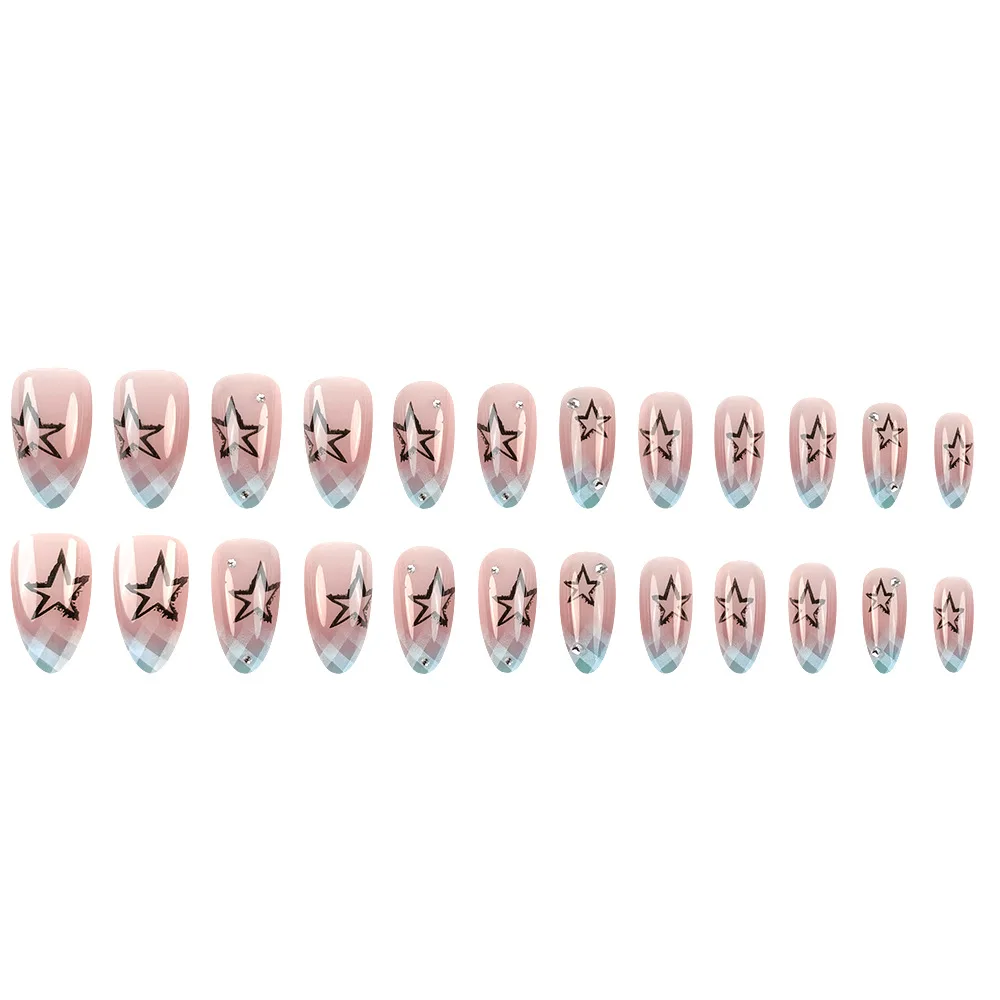 24pcs Blue Plaid Gradient Fake Nails Phototherapy French Tips Y2k Style Press On Nails Long Almond Cool Stars False Nail Patches