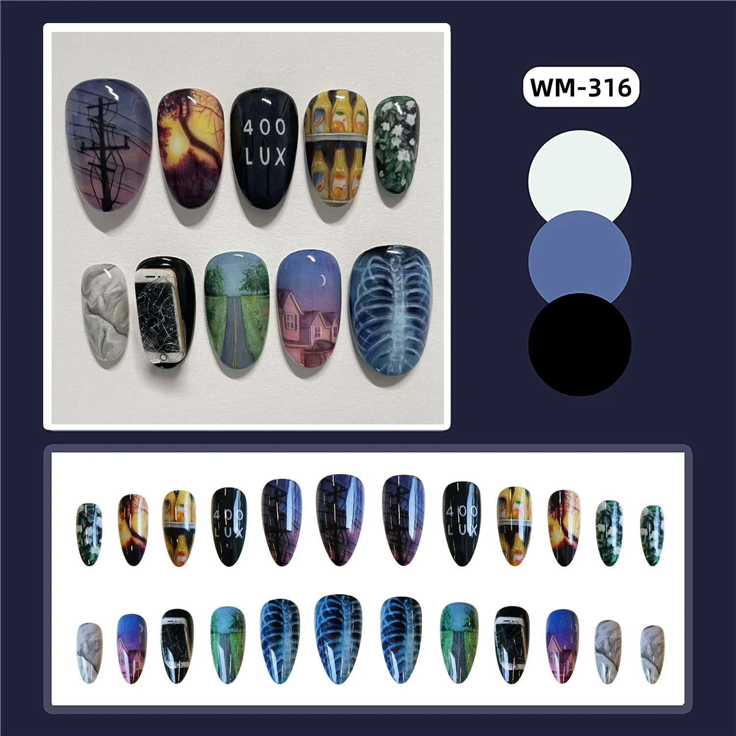 24pcs Glossy Almond Fake Nail Patches Full Cover Acrylic Material False Nails With Highway Dusk Bones Designs Press On Nail
