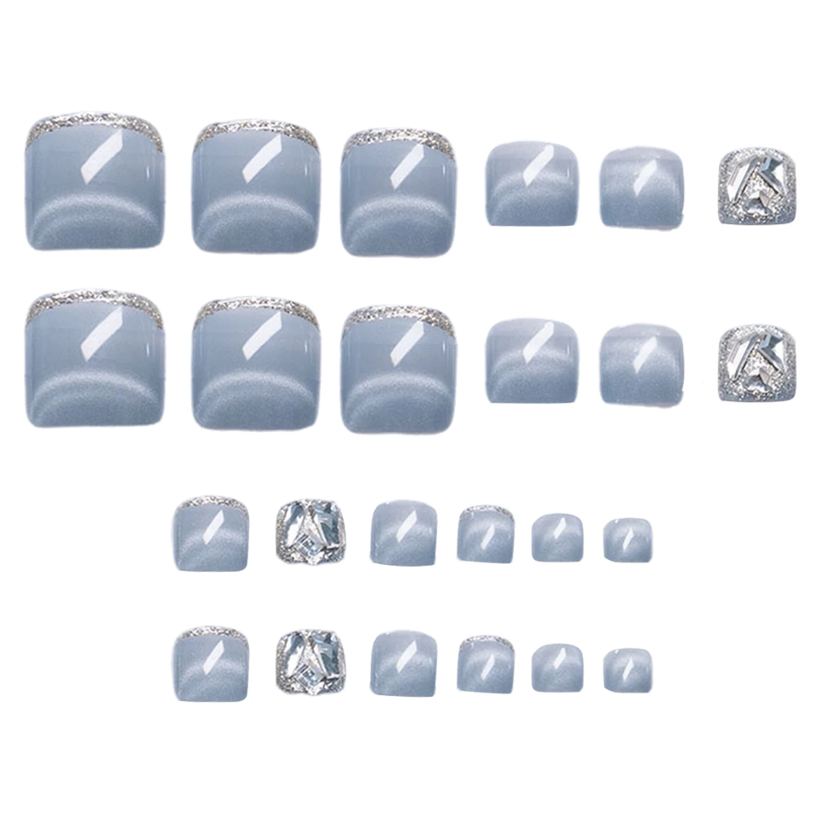 24pcs Glossy Blue Cat’s Eye Fake Toe Nails Ins French Style Flash Rhinestone Decor Press On Toenail Short Square Summer Toenails