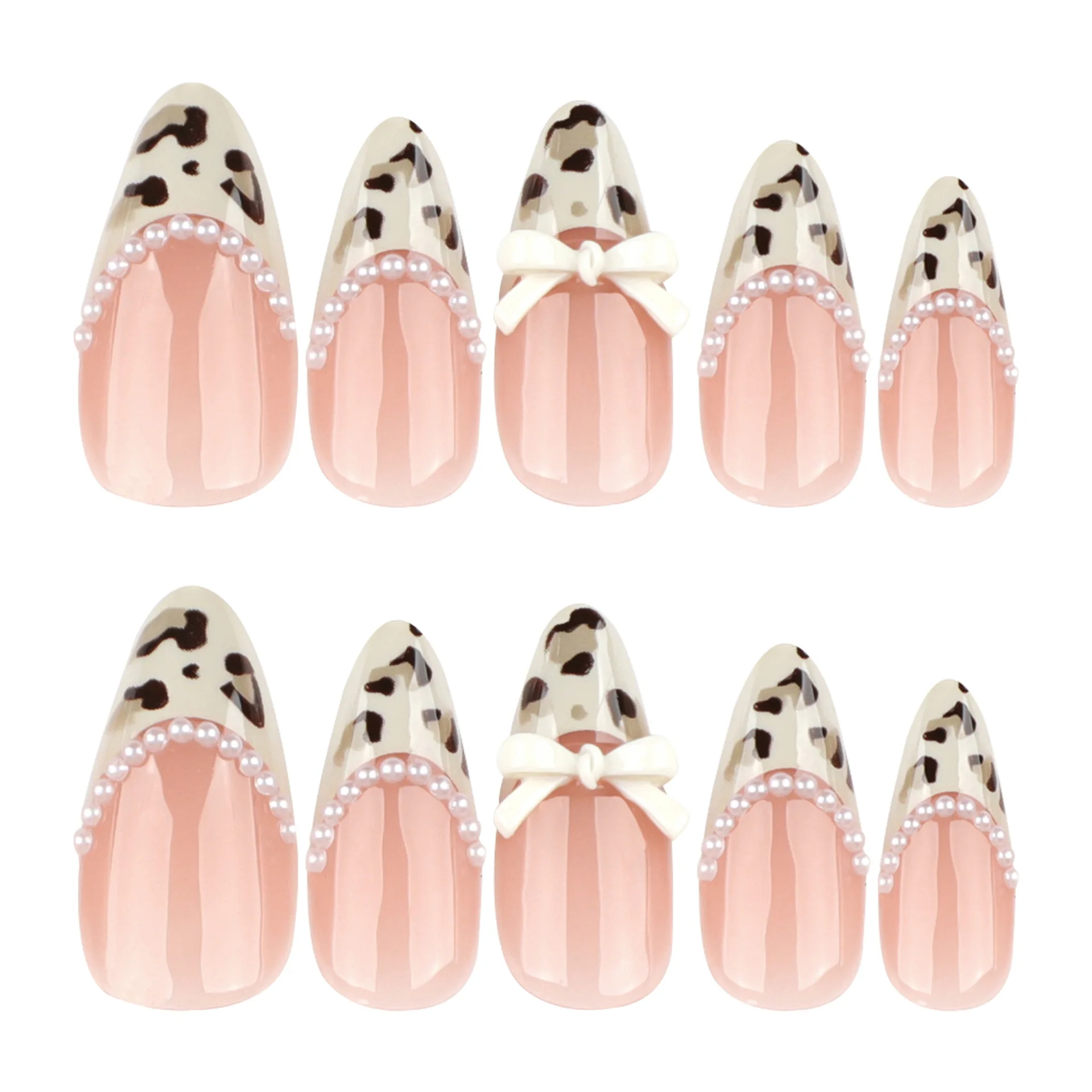24pcs Light Coffee French Style Press On Nails Leopard Print Almond Spicy Girl Fake Nails With Bowknots Pearl Decor False Nail