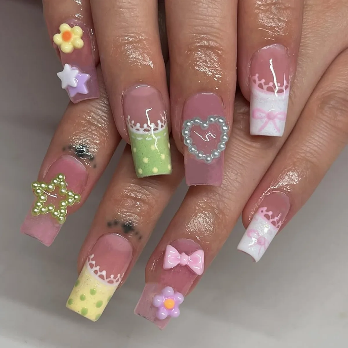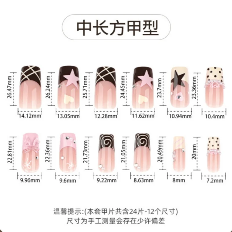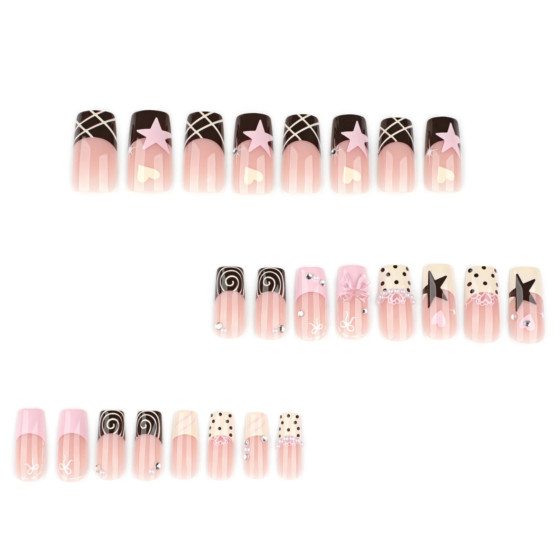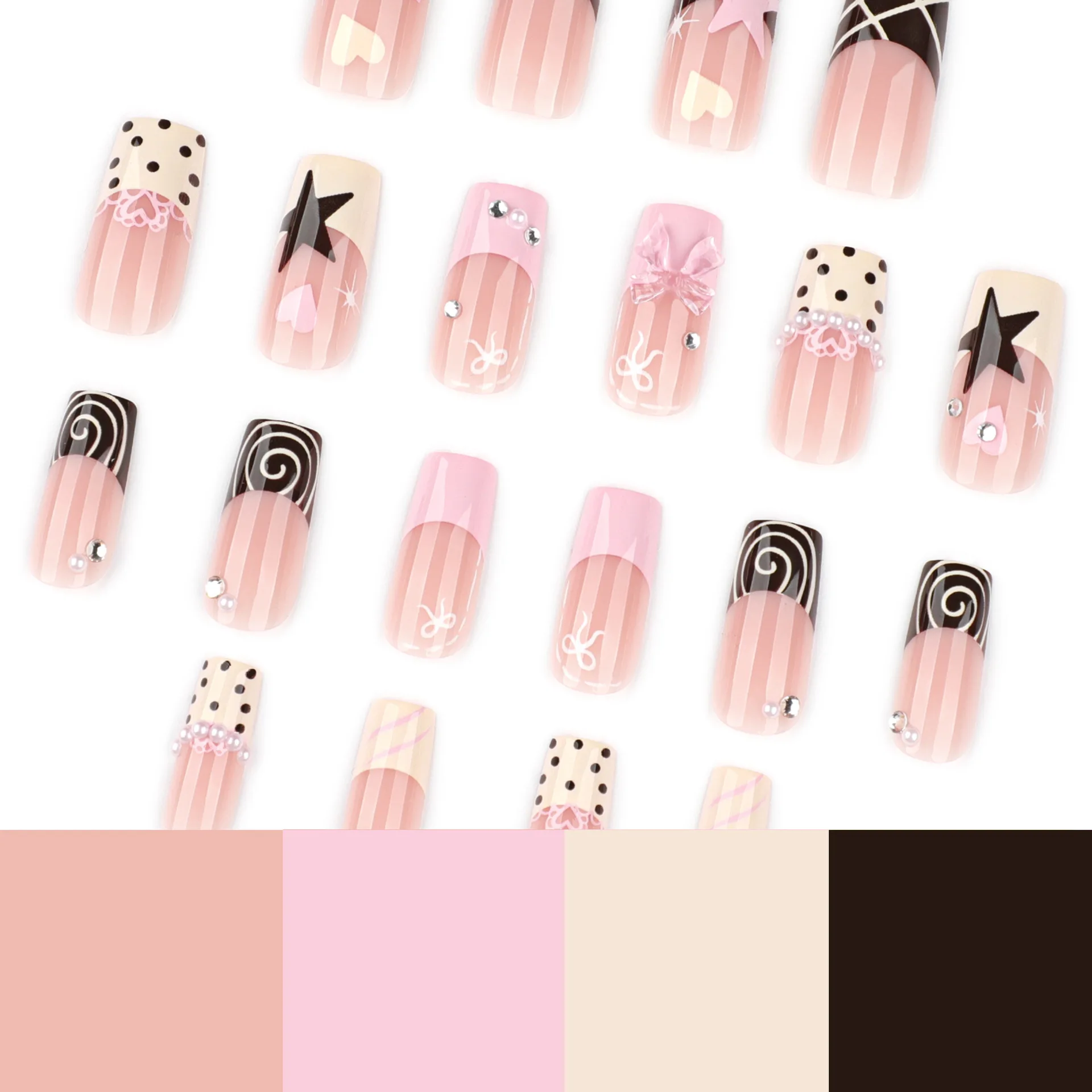 24pcs Mid-length Sqaure Fake Nails Sweet Cool Stars Spiral Stripes French Style False Nails Clear Bowknots Pearl Press On Nail