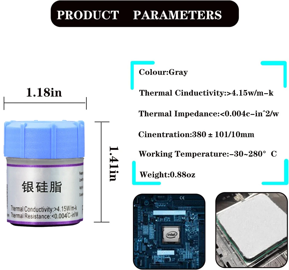 【Excellent Thermal Conductivity】The thermal paste is specially formulated to provide excellent thermal conductivity to ensure maximum heat transfer to electronic components, thermal conductivity: >4.17W/mk, thermal resistance: <0.004°C-in2/W, net weight: 25g.