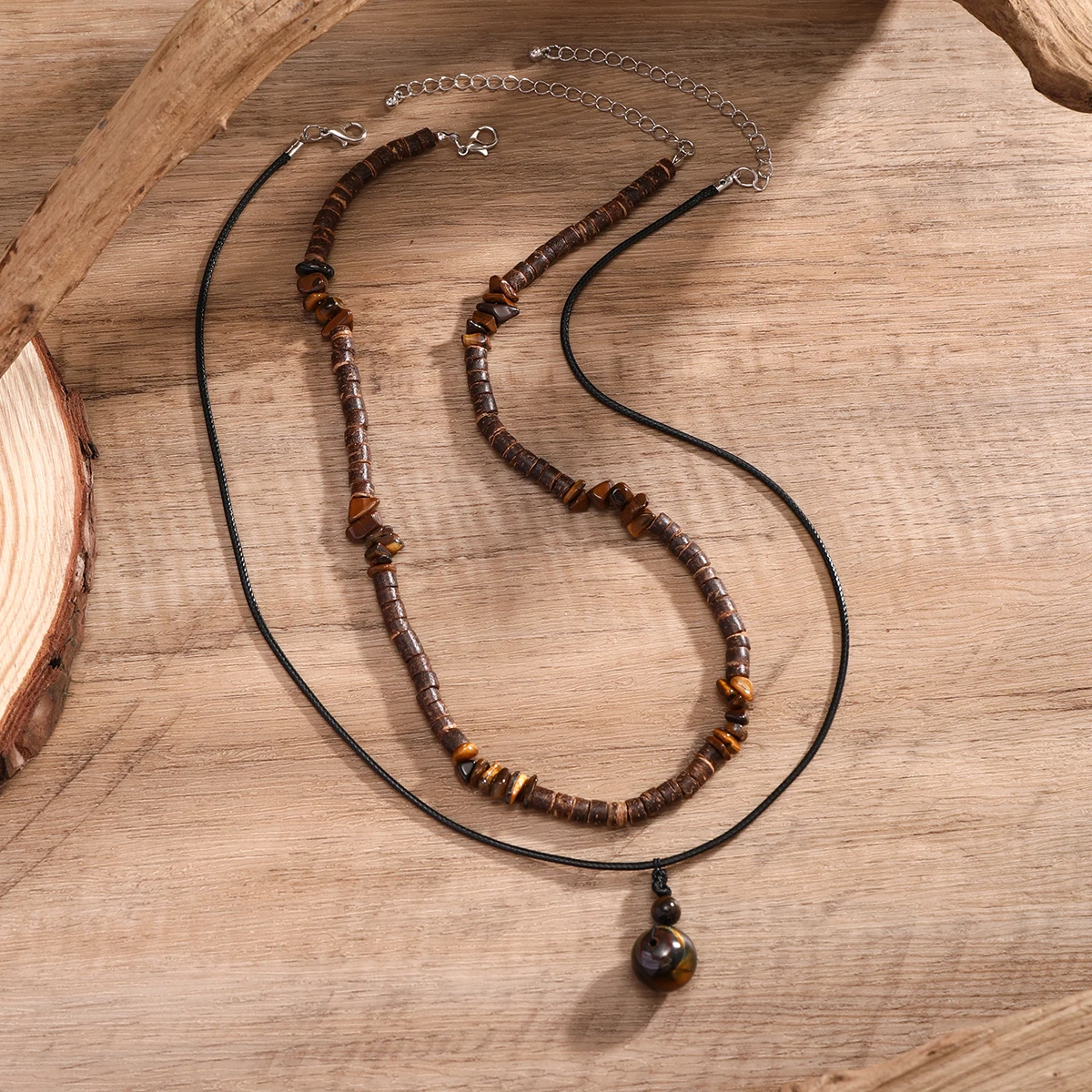 2Pcs/Set Bohemian Round Natural Stone Pendant Necklace for Men Vintage Ethnic Wood Bead Chokers Male Fashion Jewelry Accessories