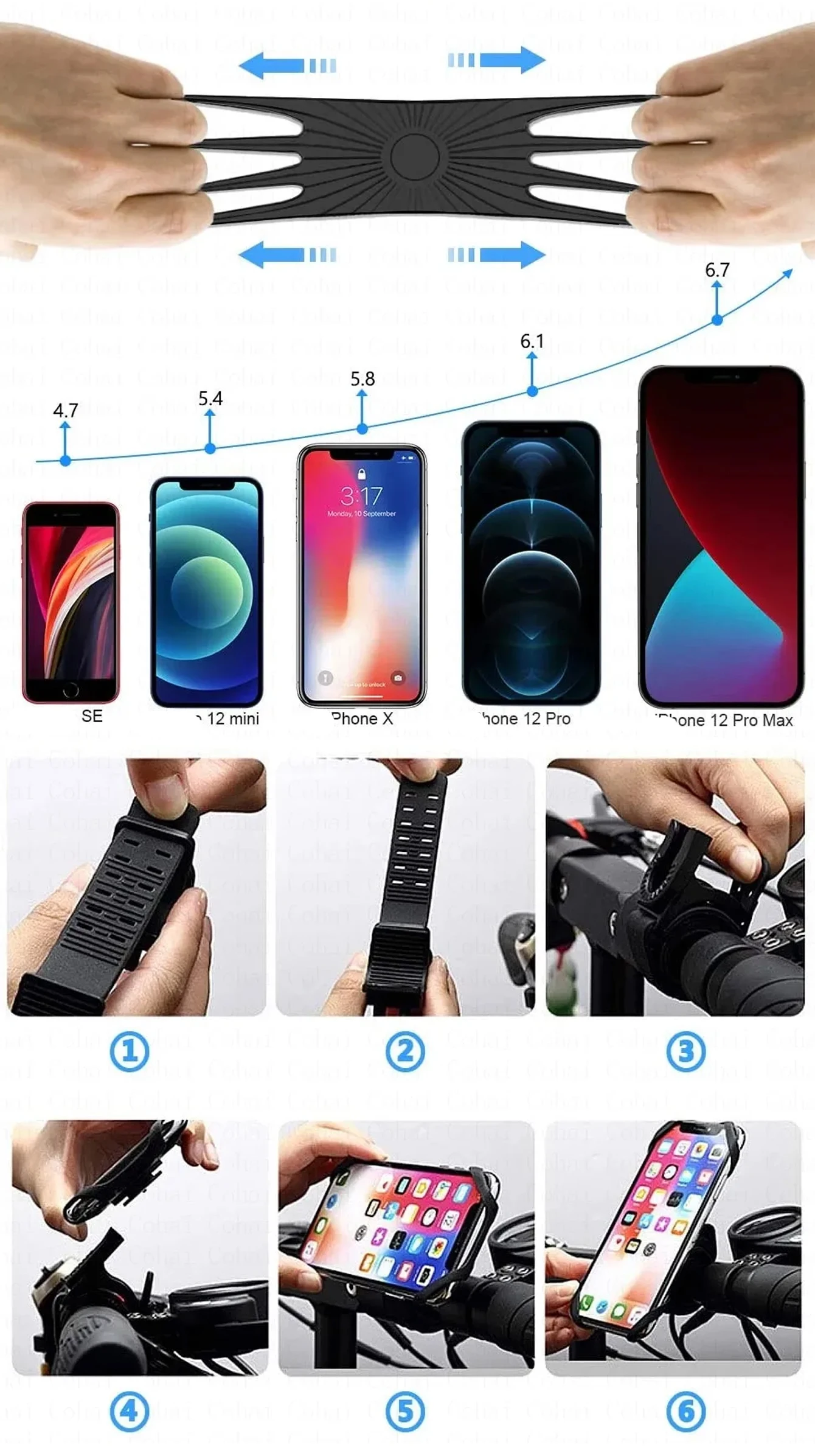 2. Universal bike stand: Super elastic silicone strap can securely hold all smartphones with screen sizes from 4.0 inches to 6.0 inches.