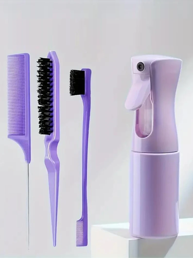 This 4-piece set includes a spray bottle, rat tail comb, teasing hairbrush, and edge control comb, providing a comprehensive solution for various styling needs.