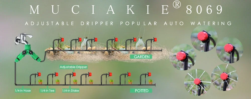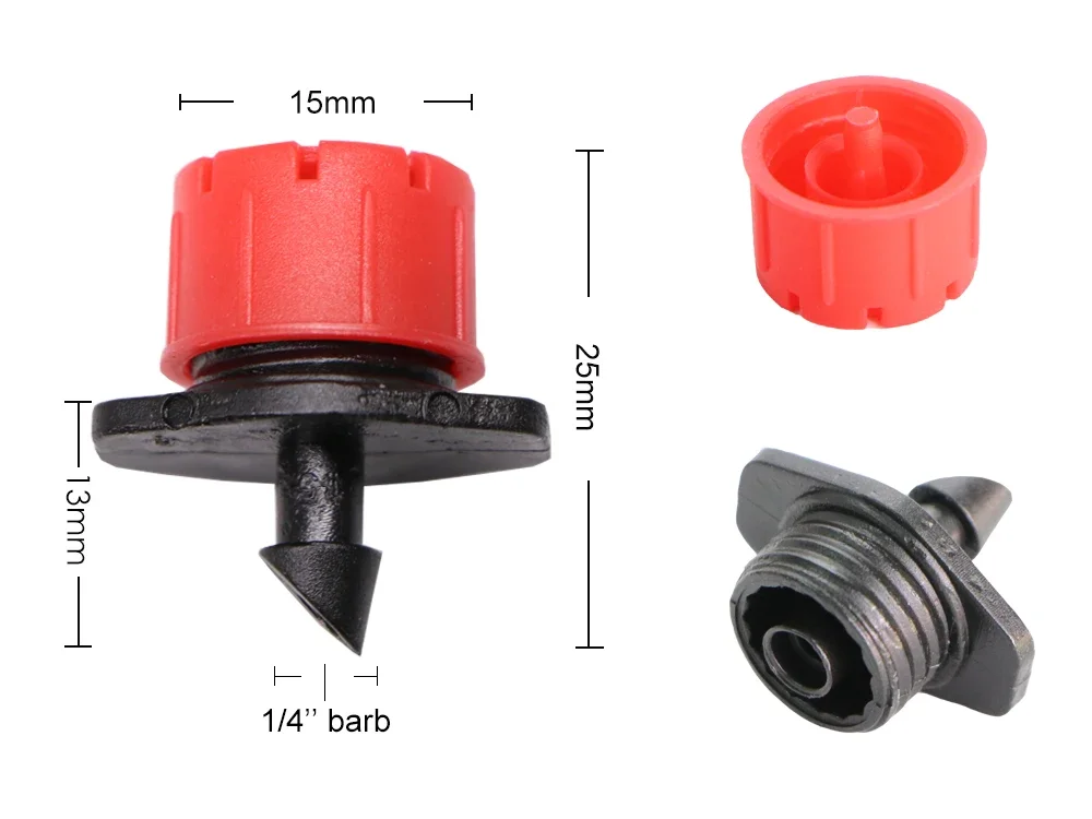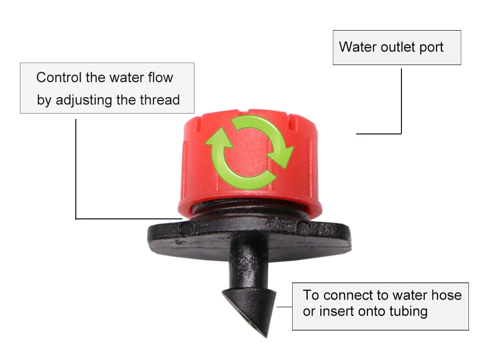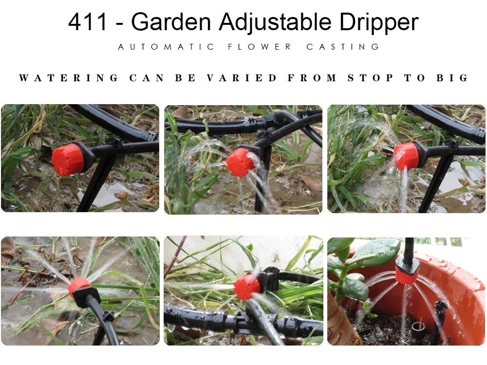 –ADJUSTABLE DRIPPER: 8-OUTLET. Adjustable – Its flow adjustment means watering can be varied from a big spray, to gentle stream pattern to a drip action or shut off completely. Simple finger-tip cap control for flow adjustment.