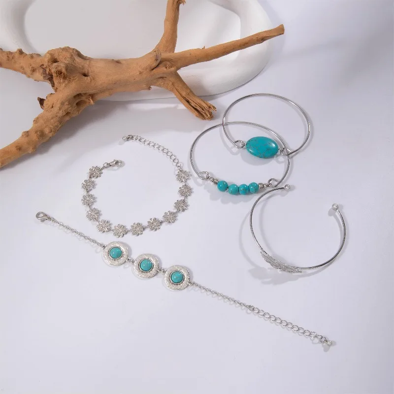 5pcs/set Vintage Imitation Turquoise Butterfly Bracelet Set for Women Classic Flower Feather Bangle Adjustable Jewelry Party