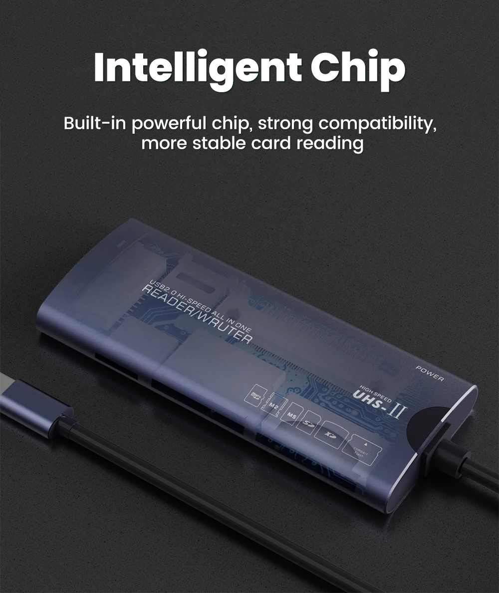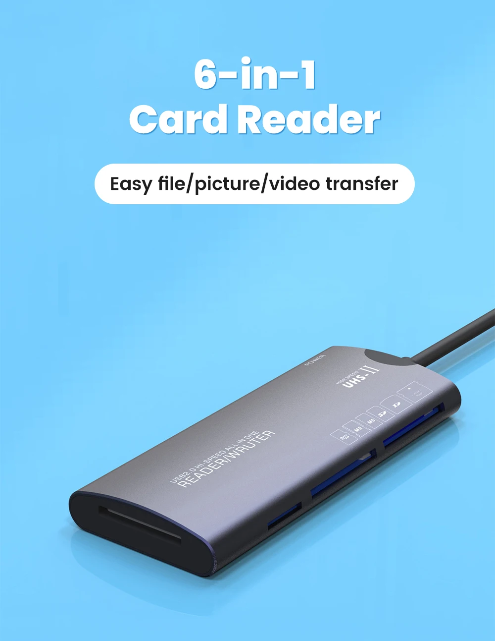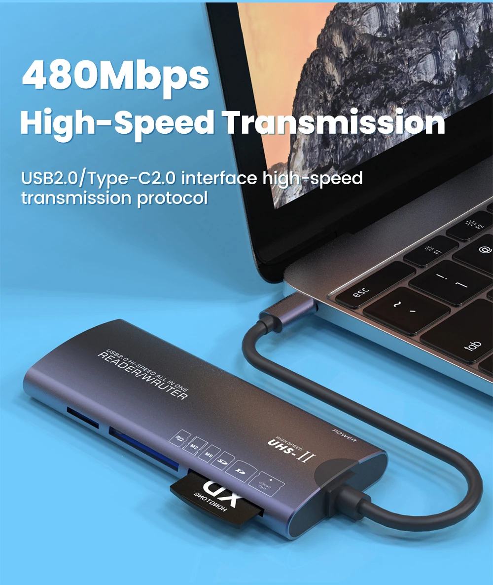 6-in-1 USB/Type-C Card Reader – 480Mbps for SD/TF/XD/CF/M2/MS, LED Light, Durable Cable, Intelligent Chip