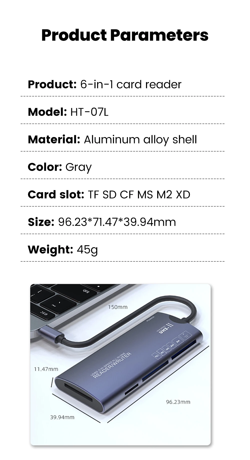 Be the first to review “6-in-1 USB/Type-C Card Reader – 480Mbps for SD/TF/XD/CF/M2/MS, LED Light, Durable Cable, Intelligent Chip” Cancel reply