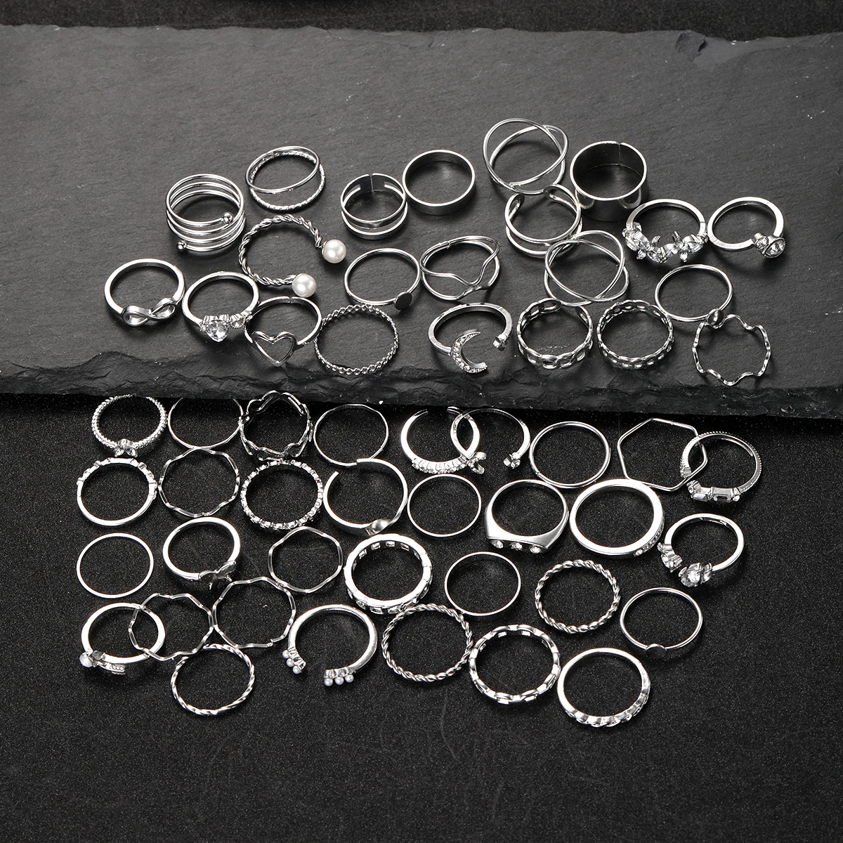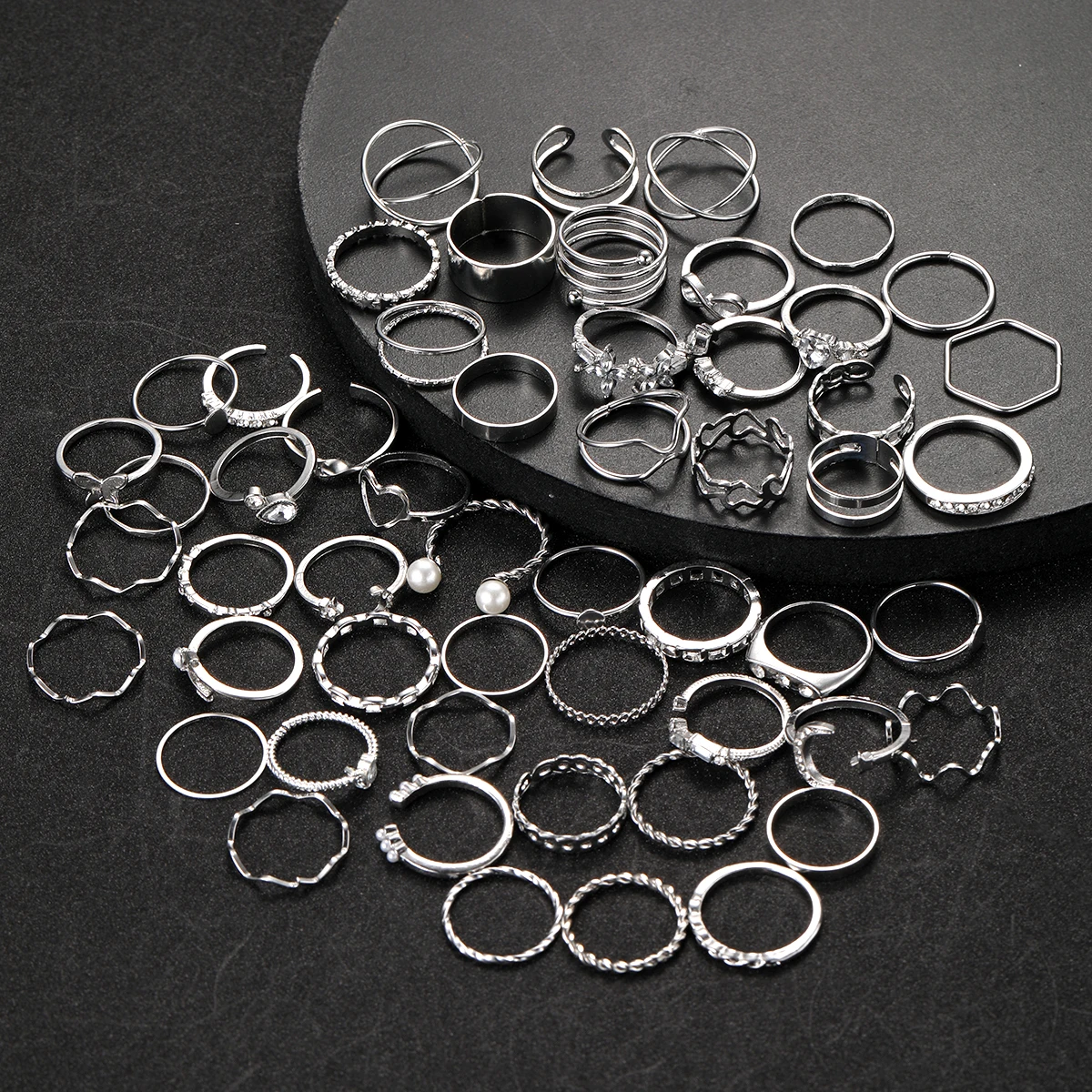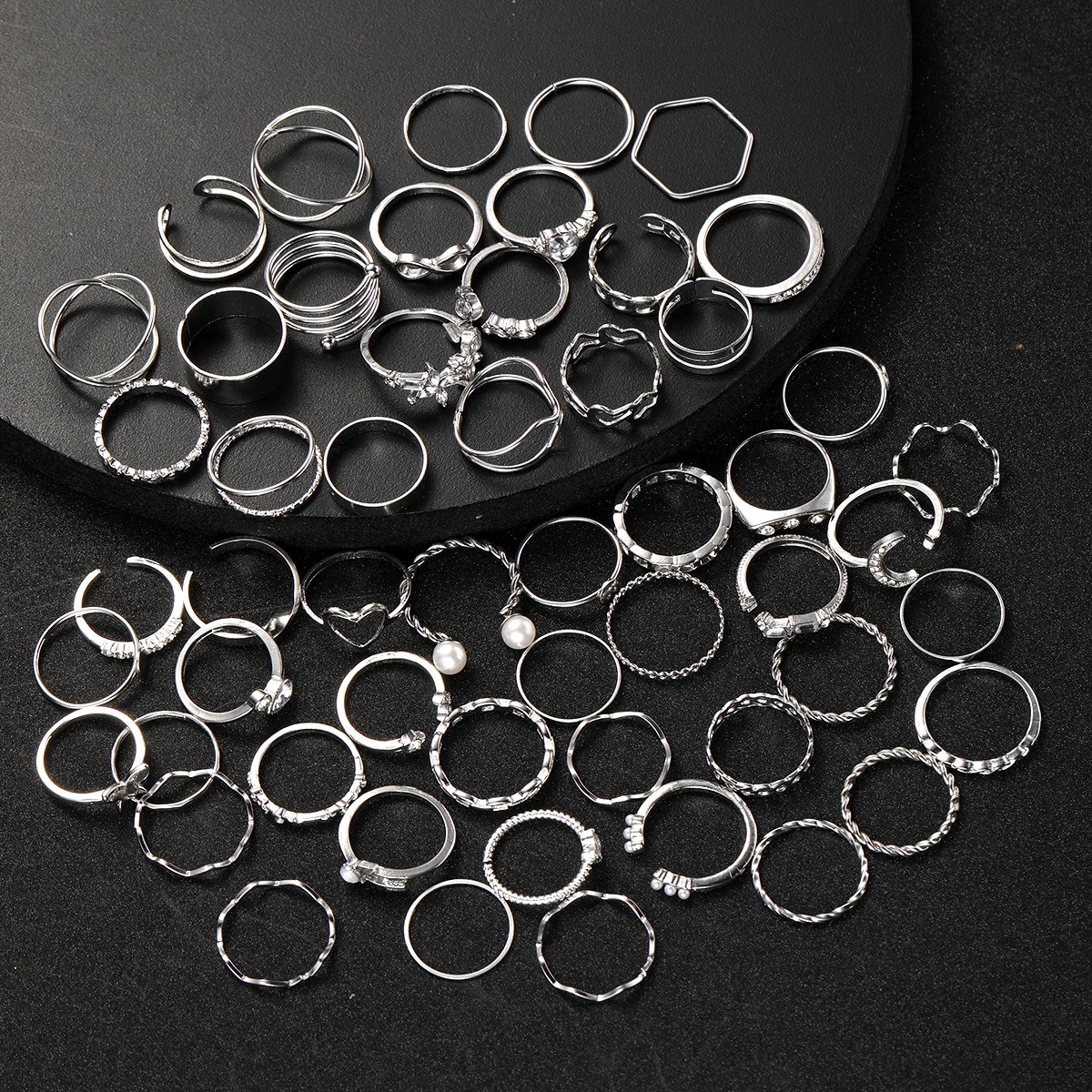 60Pcs/Set Fashion Imitation-Pearl Heart Butterfly Ring Set Woman‘s Silver Color Geometric Hollow Crytasl Ring Daily Wear Jewelry