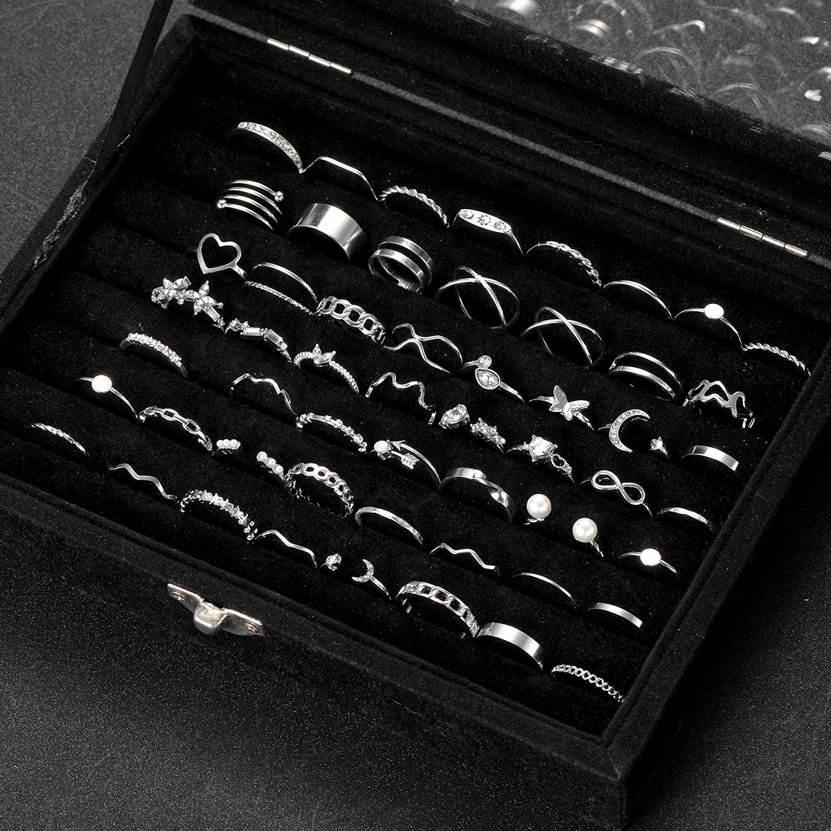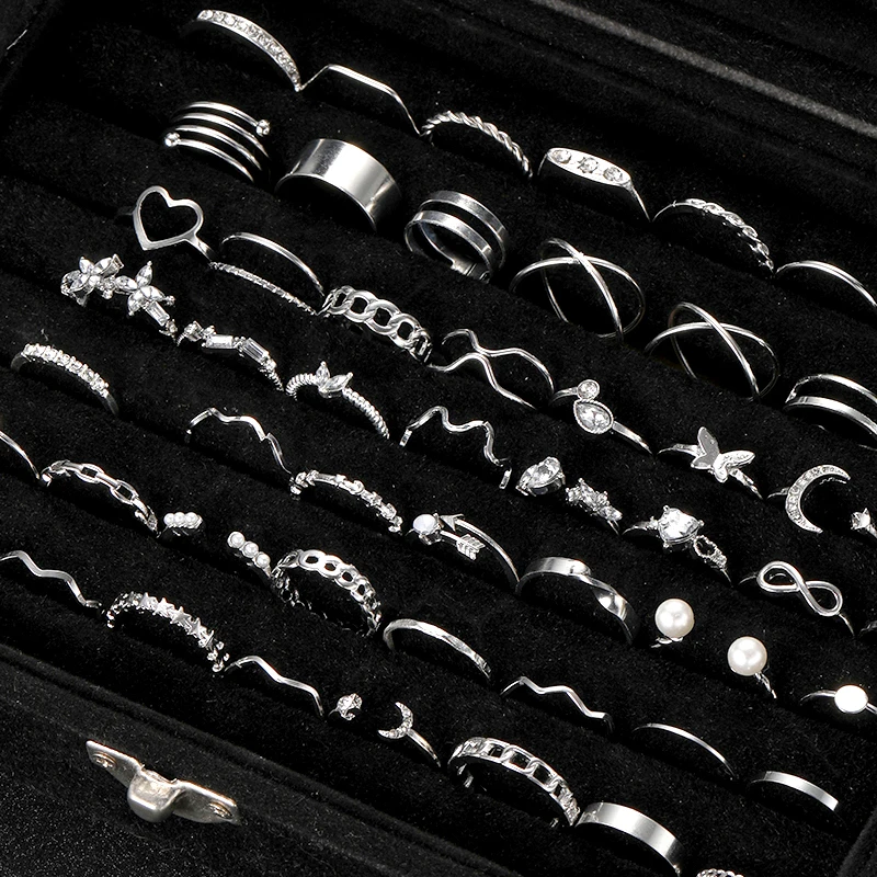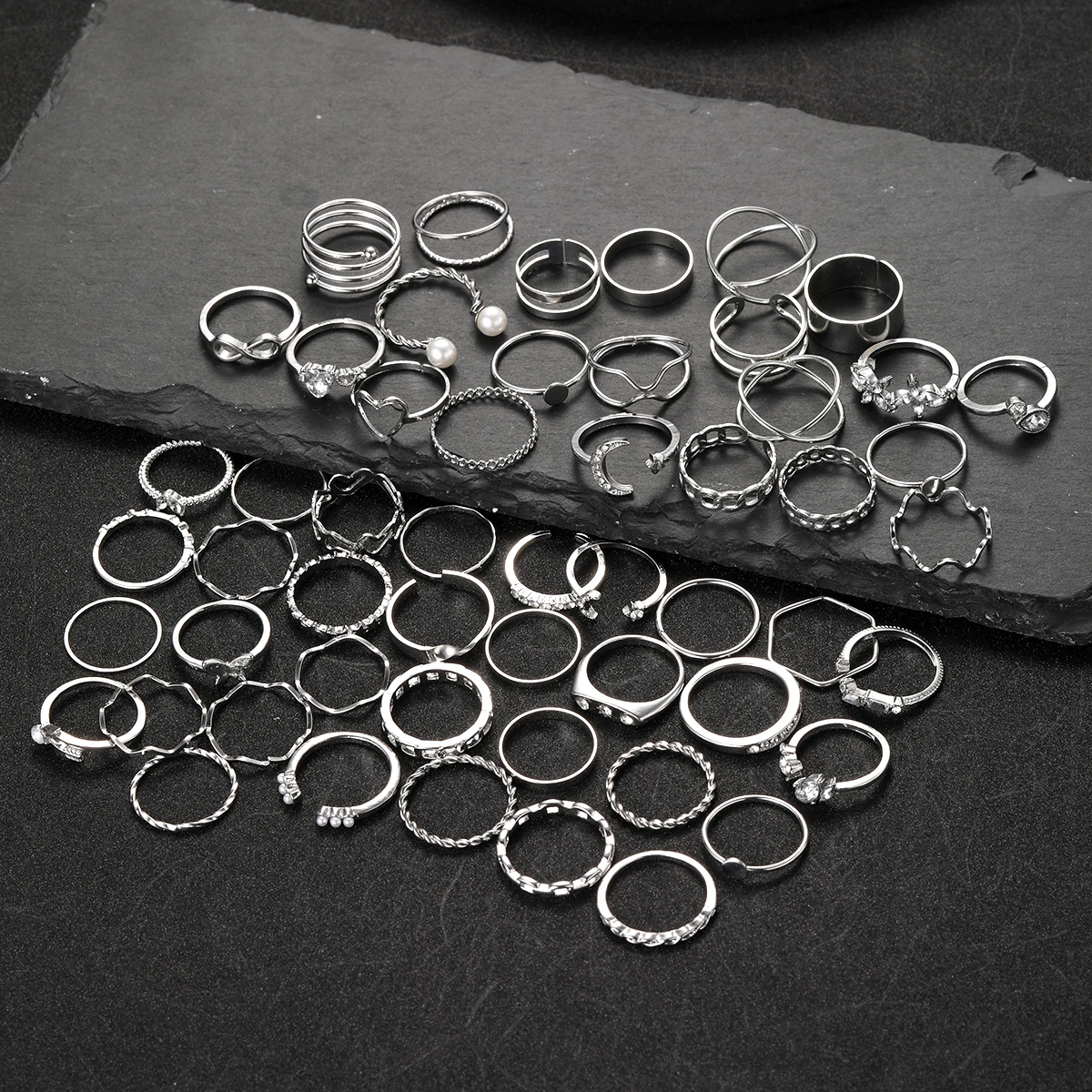 60Pcs/Set Fashion Imitation-Pearl Heart Butterfly Ring Set Woman‘s Silver Color Geometric Hollow Crytasl Ring Daily Wear Jewelry