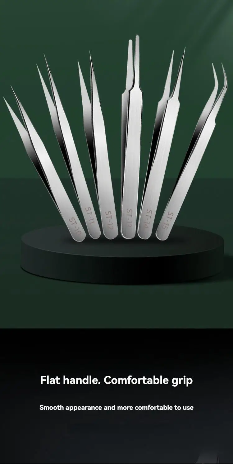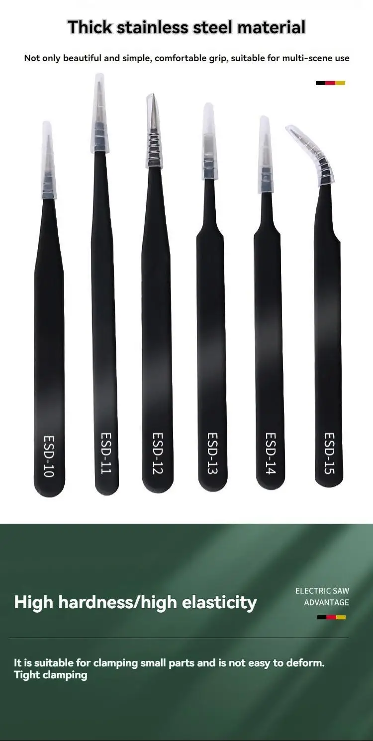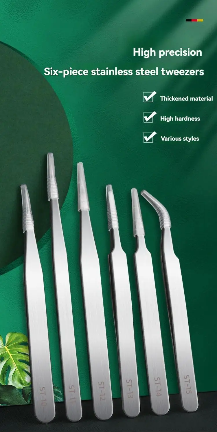 Clear filters• Precision Long Tweezers Set :This set includes 6 precision long tweezers, perfect for detailed work in electronics repair and crafting.