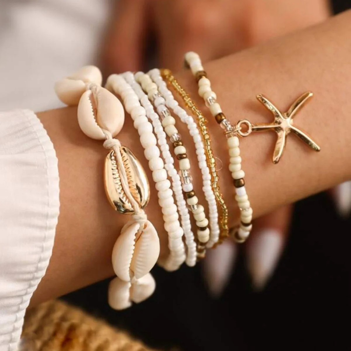 7pcs/set Bohemian Holiday Wind Shell Beaded Woven Bracelet Starfish Rice Beads Women’s Bracelet Set Beach Party Seaside Holiday