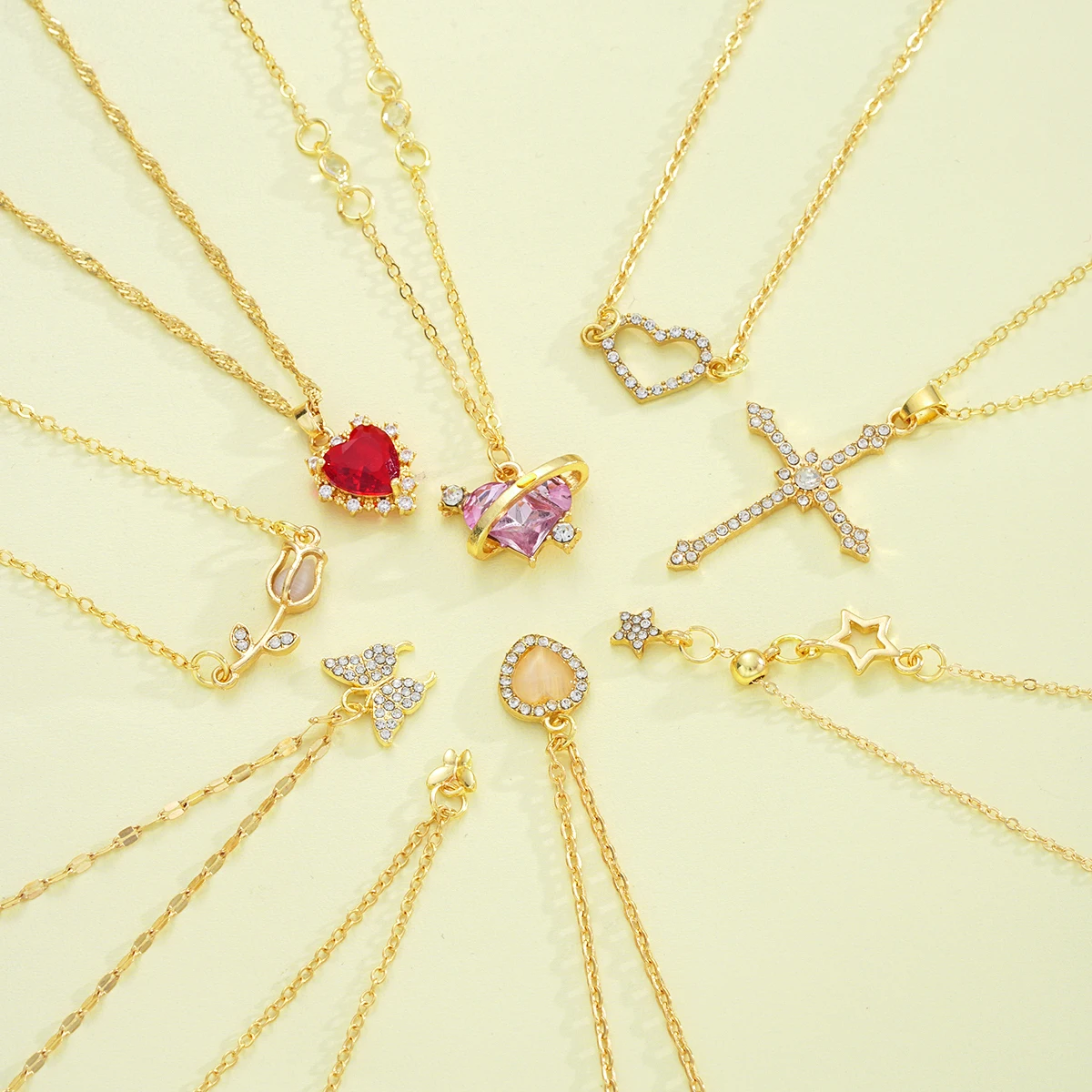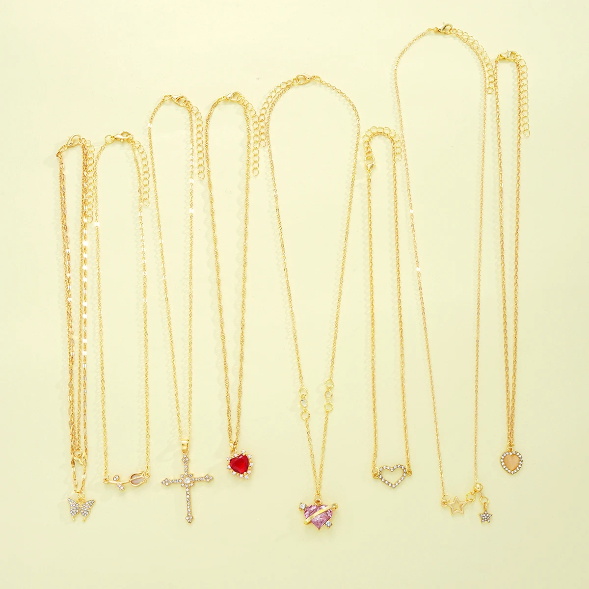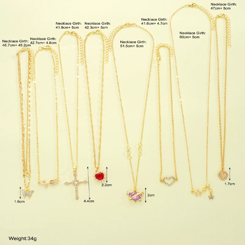 8 Pcs Simple Temperament Necklace Set For Women Elegant Gold Color Crystal Butterfly Cross Rose Heart Star Pendant Necklaces