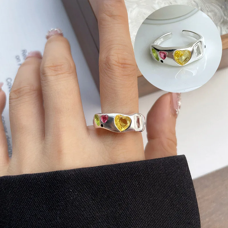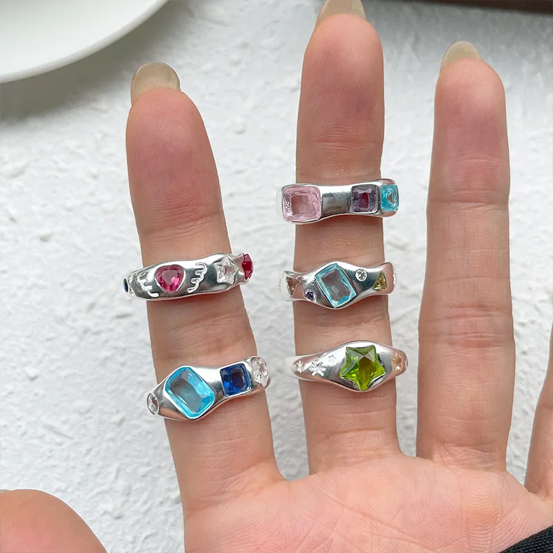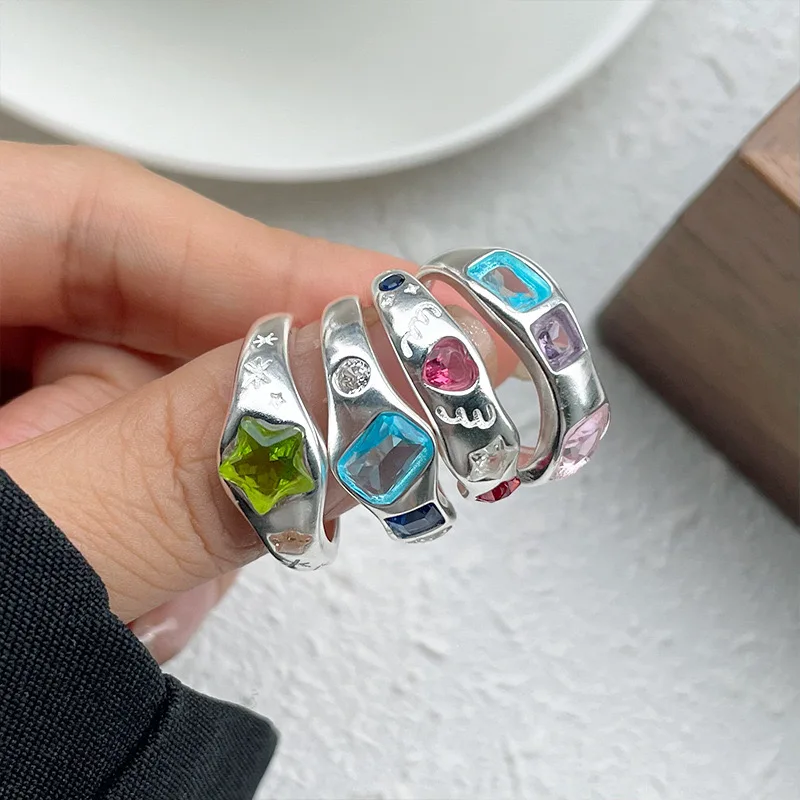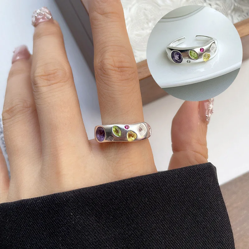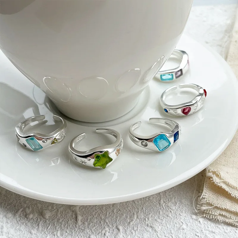925 Sterling Silver Rings For Women Geometric Fine Jewelry Finger Adjustable Simple Colorful Stone Ring For Party Birthday Gift
