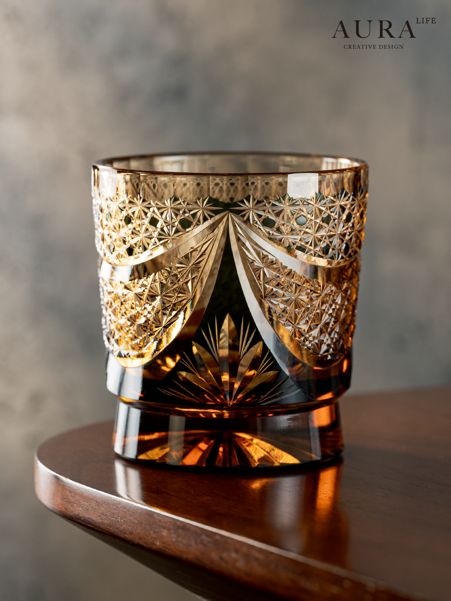 AURA’S Black Samurai Japanese Edo Kiriko handmade glass whiskey cup carved amber cup