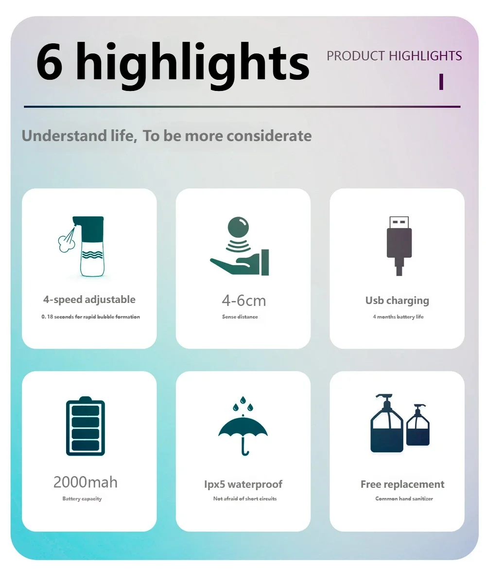 1. Near-field infrared induction bubble generation in 0.25 seconds, no need to press to avoid touching germ, fully upgraded and automatic bubble generation, convenient and fast
