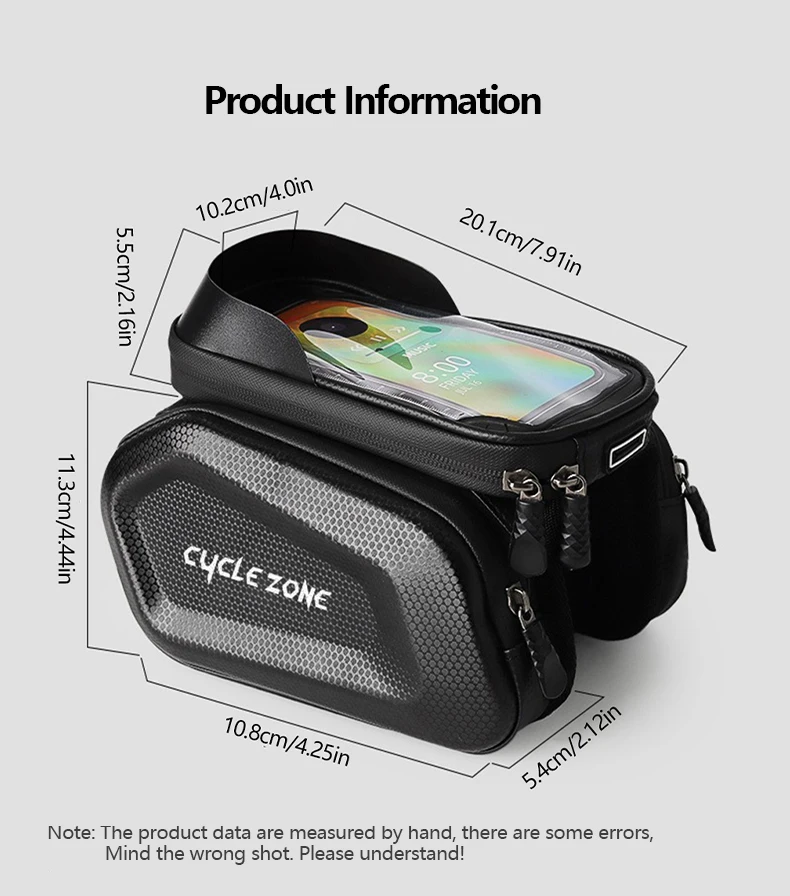 4. Waterproof Fabric: The bike front frame bag is equipped with a waterproof zipper and constructed with waterproof fabric, ensuring light rain resistance. While it can withstand mild showers and splashes, please note that it is not suitable for prolonged exposure to heavy rain.