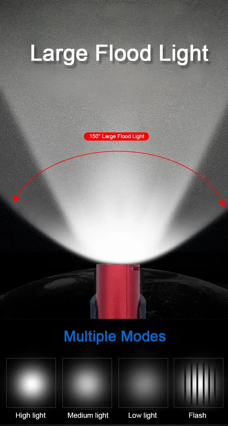 4 lighting modes: strong light – medium light – weak flash light – off (click to switch).