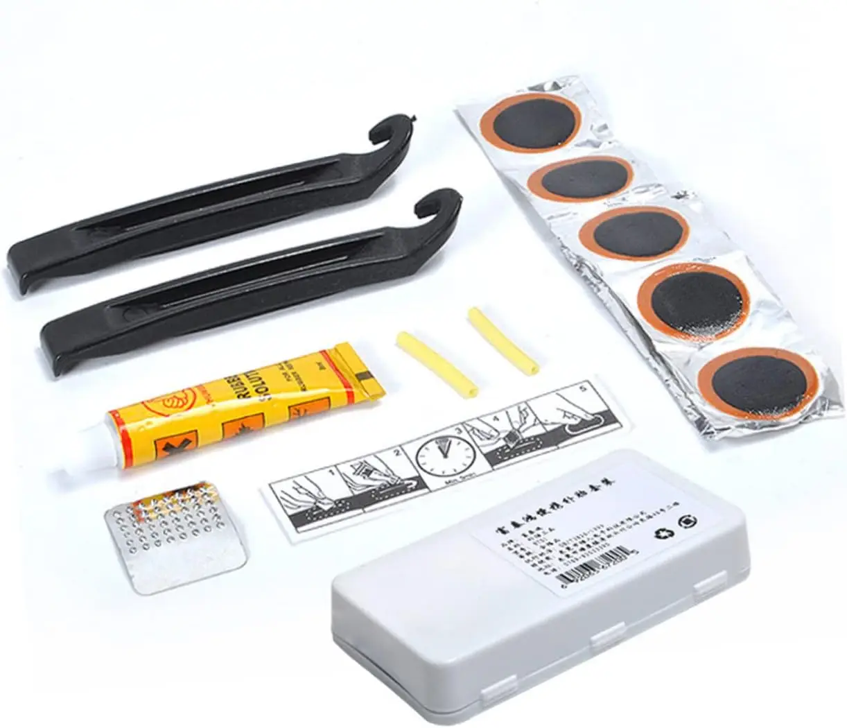 Bicycle First Aid Kit (repair kit) is designed for prompt repair of the puncture site of the bicycle camera. Just rinse the puncture site, apply glue and apply a patch. Patches are made of dense material, so after repair, you can ride your bike for a long time. The camera repair kit can be taken on long trips to prevent emergencies.