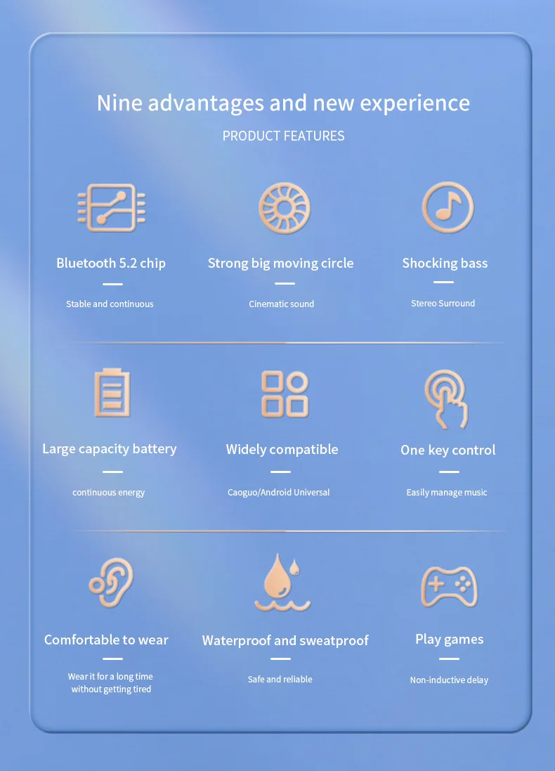 Features: waterproof, sweat-proof, youth, sports headphones, long standby, stable connection, and ear hanging prevention.