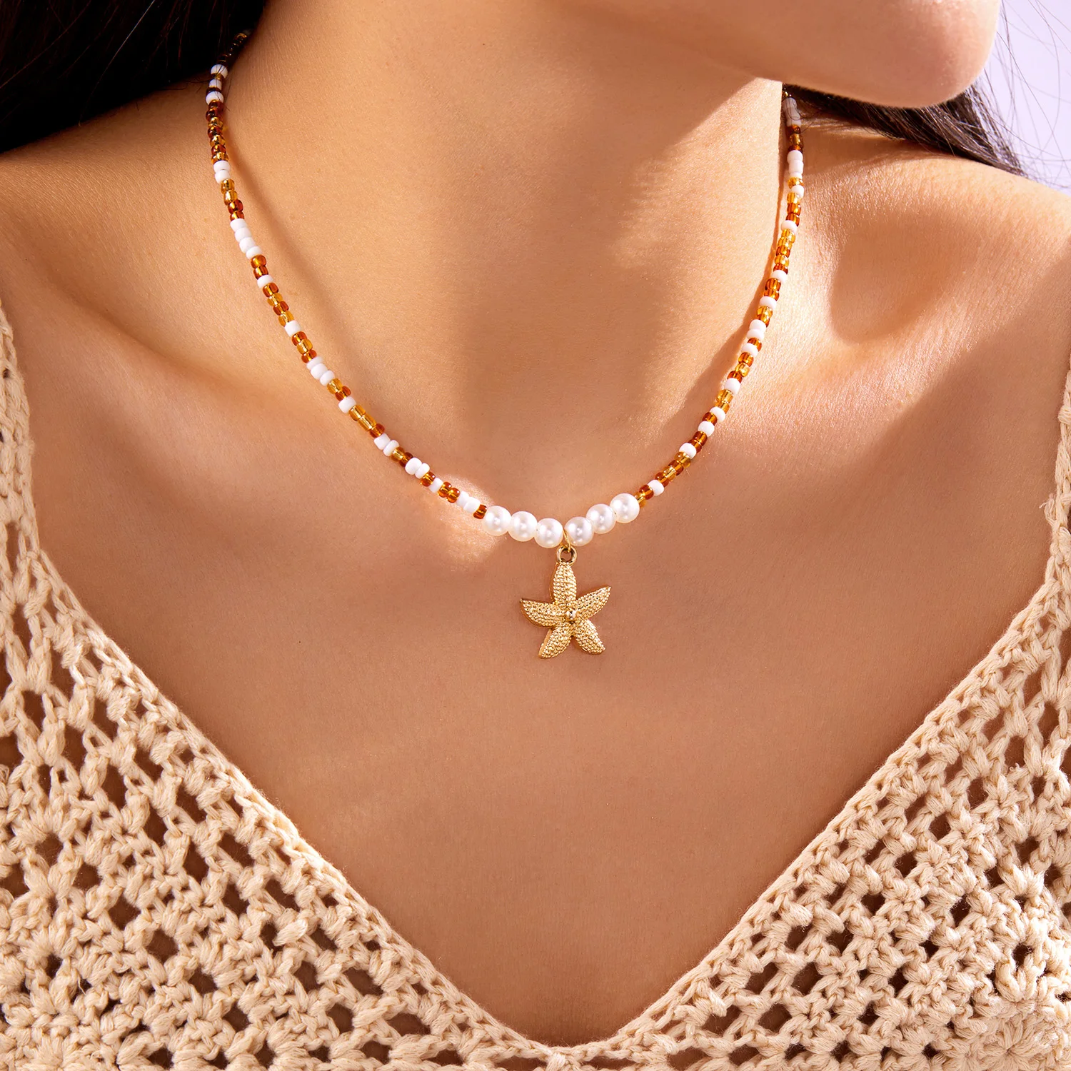 Bohemian Rice Beads Starfish Pendant Necklace for Women Handmade Imitation Pearl Colorful Beaded Choker Summer Beach Jewelry