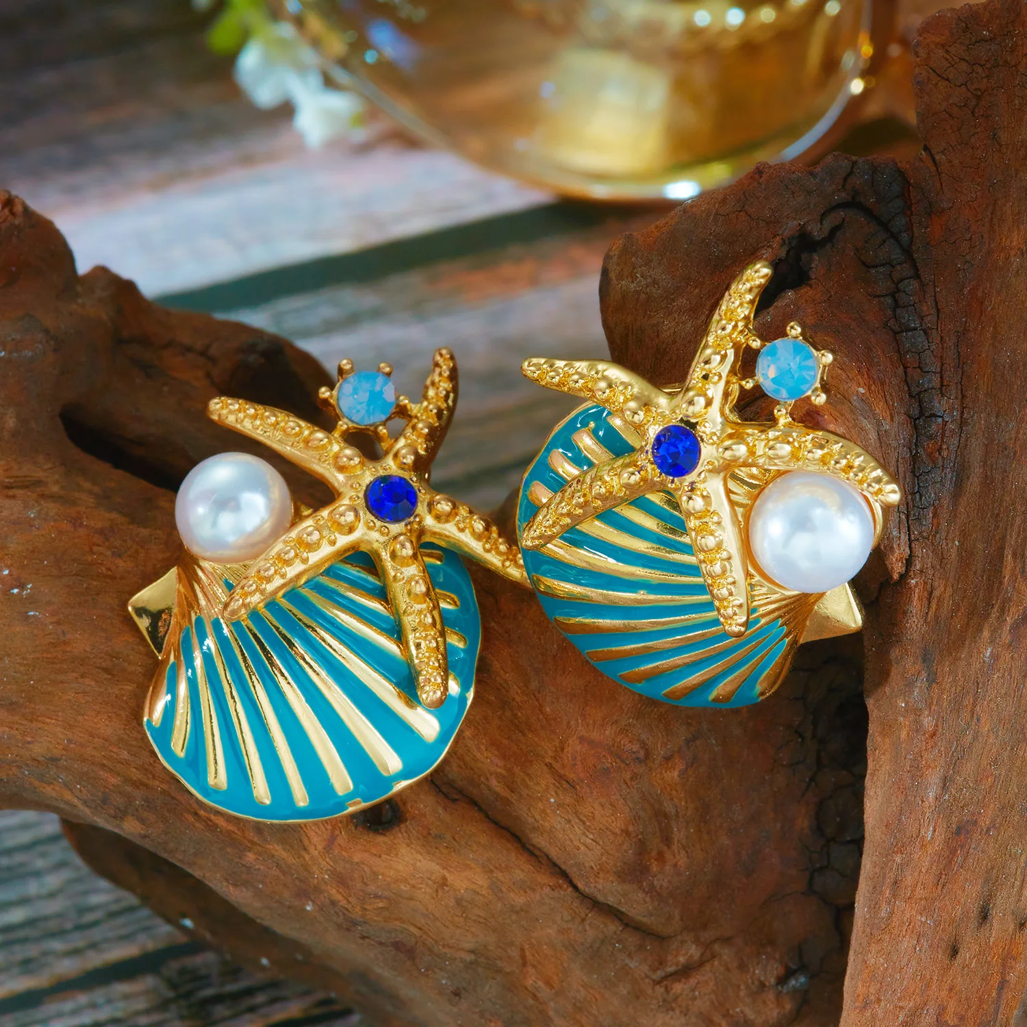 Boho Starfish Shell Coral Pearl Pendant Necklace For Women Shiny Crystal Zircon Dripping Oil Beach Clavicle Choker Charm Jewelry