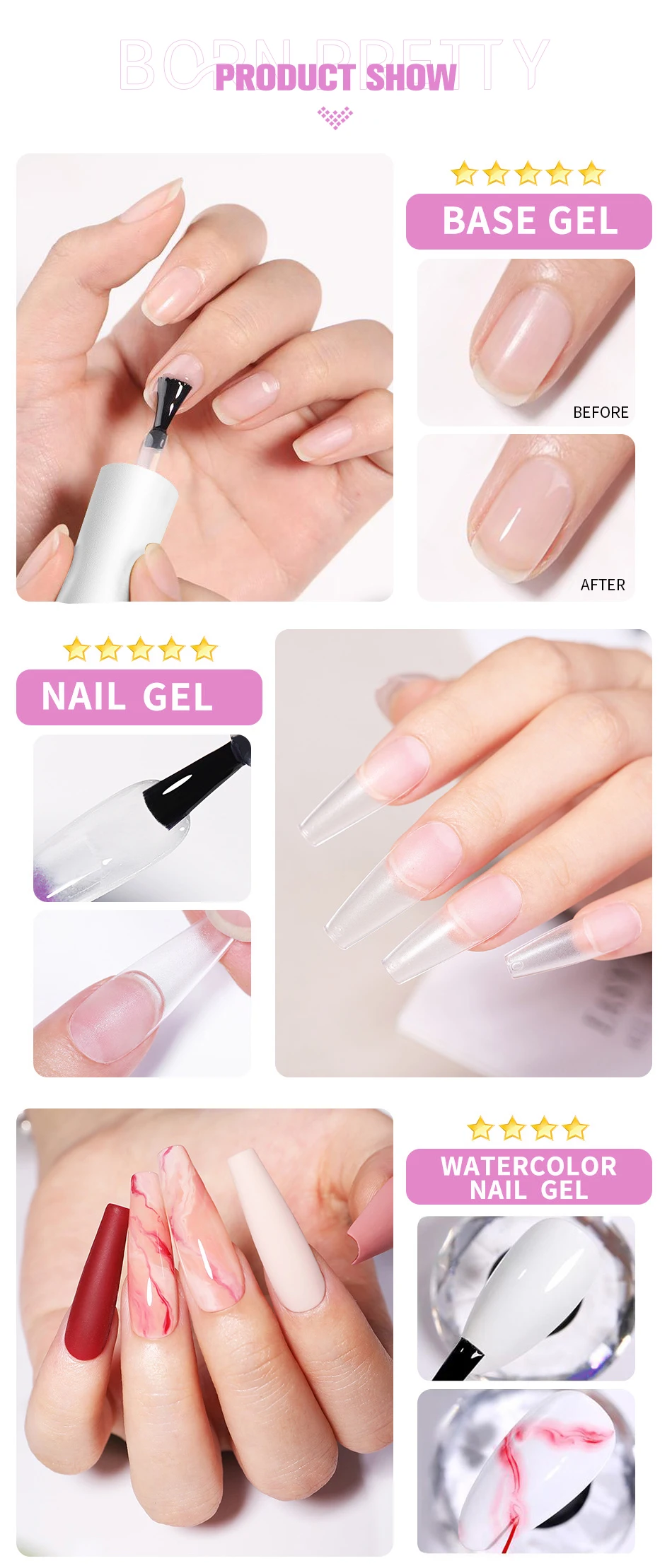 Multiple functions:Used for base gel/nail glue/watercolor nail gel/nail reinforcement gel/extension gel/nail liquid slip solution/color mixing/rhinestone gel